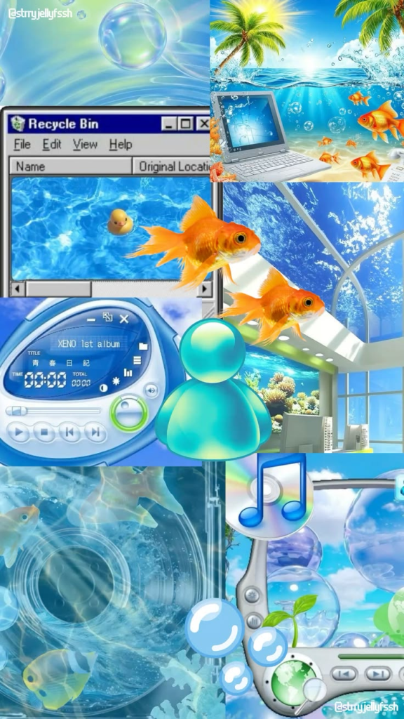 Images of translucent blue iMacs or old-school flip phones sitting on a beach towel. It’s the ultimate “tech-meets-tropic” vibe that defines the aesthetic so well.