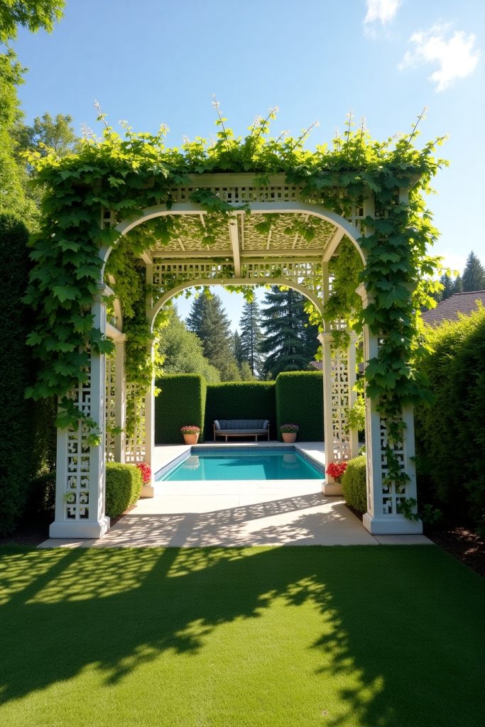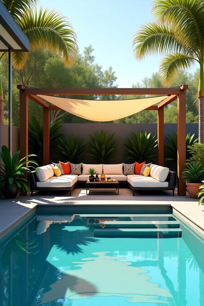 A pergola or shade sail offers much-needed relief from the sun and helps define a lounging space beside your pool. Pergolas are sturdy and stylish, with options to hang plants, curtains, or lights. Shade sails are more affordable and modern-looking, easily stretched across posts or anchored to existing structures.