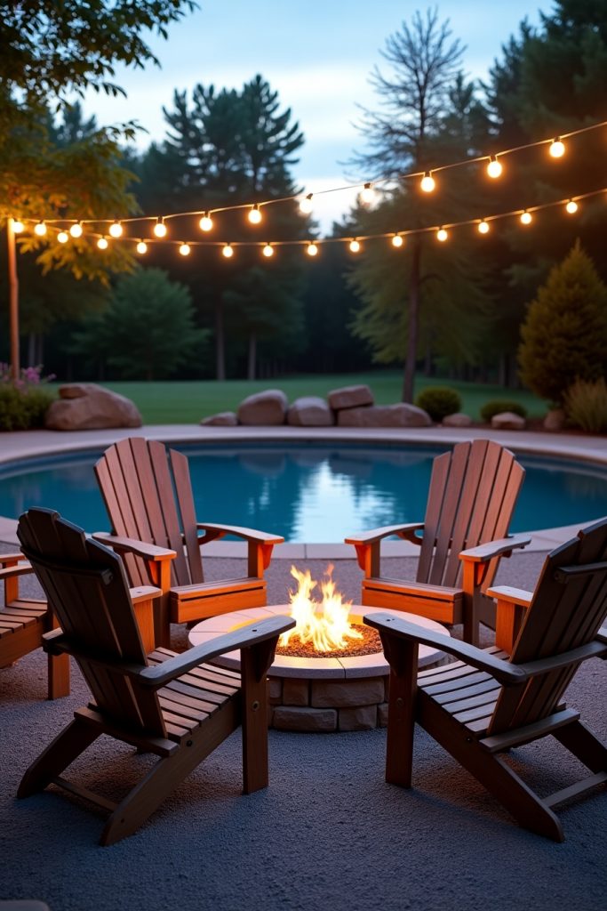 Create a multi-functional entertainment zone by adding a seating area with a fire pit near your pool. Use pavers, gravel, or decking to define the area and arrange cushioned chairs or benches around a central fire feature. It’s perfect for cozy evening gatherings or roasting marshmallows after a day of swimming.