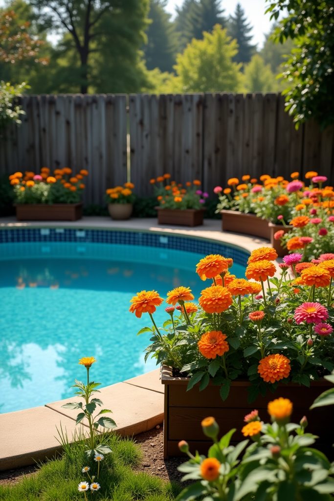 Surrounding your pool with lush flower beds or raised planters softens the area and adds bursts of color and texture. These plantings help integrate the pool into the rest of your backyard, creating a cohesive and vibrant space. Raised beds can define borders while making it easy to switch out plants with the seasons or your mood.
