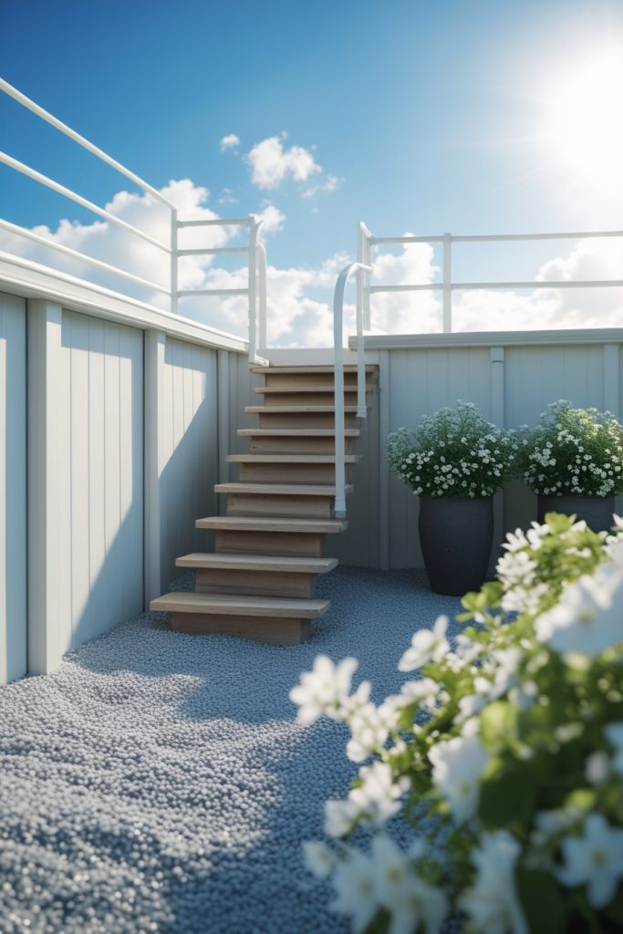 Wooden steps make entry into the pool easier and safer, especially for children or older swimmers. They can be stained or painted to match your deck or left natural for a rustic touch. Together, gravel and wood create a low-maintenance, grounded pool setup that’s both practical and attractive.