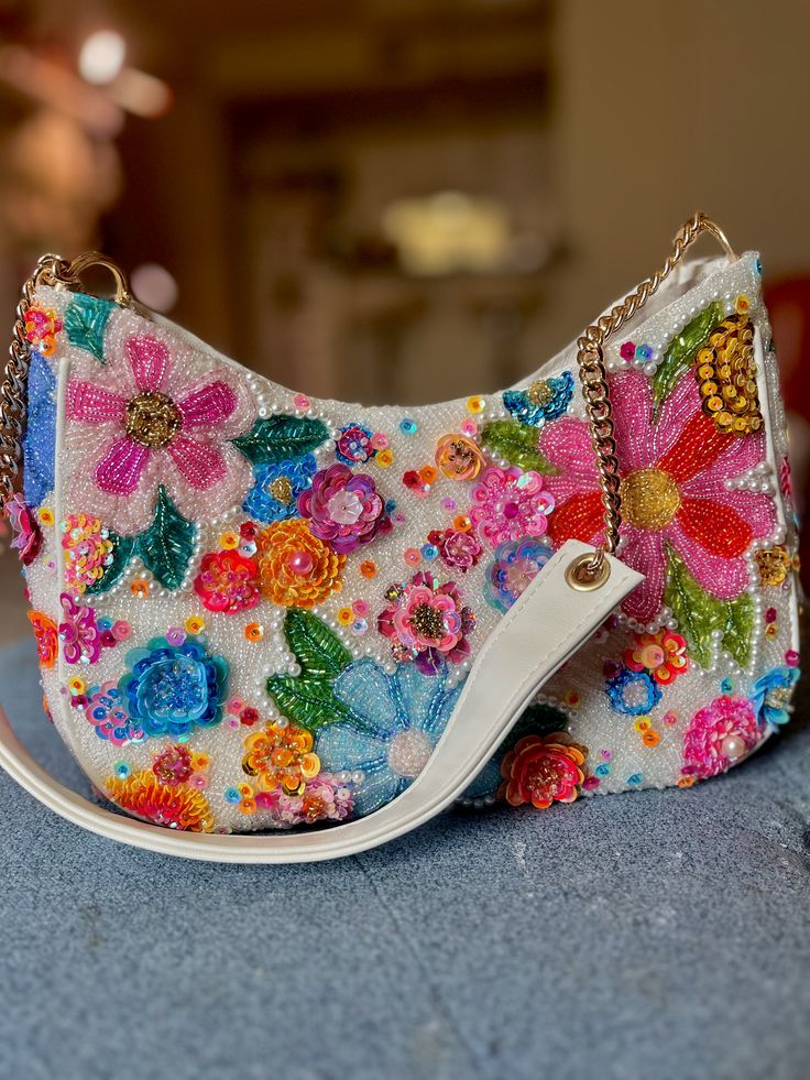 This beaded handbag feels like carrying a little garden in your hands. The mix of colorful flower patterns instantly makes the bag look cheerful, playful, and completely unique.