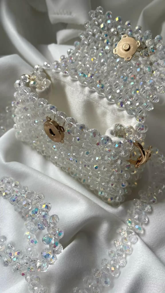 Using clear or iridescent beads creates that glass-like effect that feels modern and elegant. Adding silver hardware or a shiny handle makes the entire bag look even more polished.