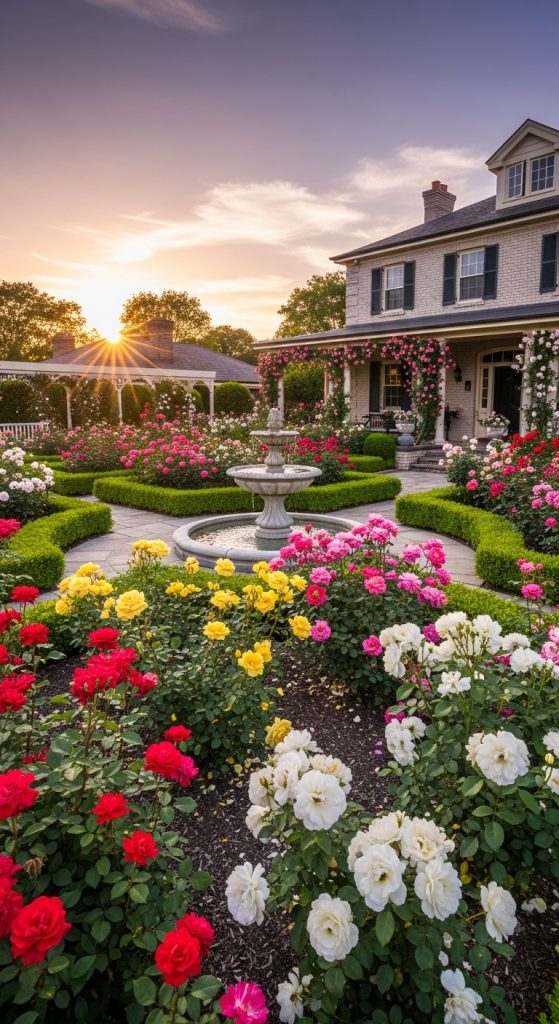 A structured rose garden works because it balances abundance with order. Symmetrical beds, defined borders, and clear pathways prevent visual overwhelm and make maintenance practical. Structure provides rhythm, allowing the blooms to stand out without chaos.
