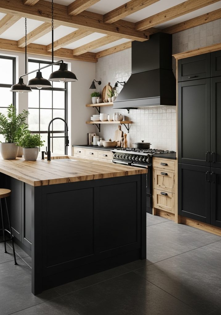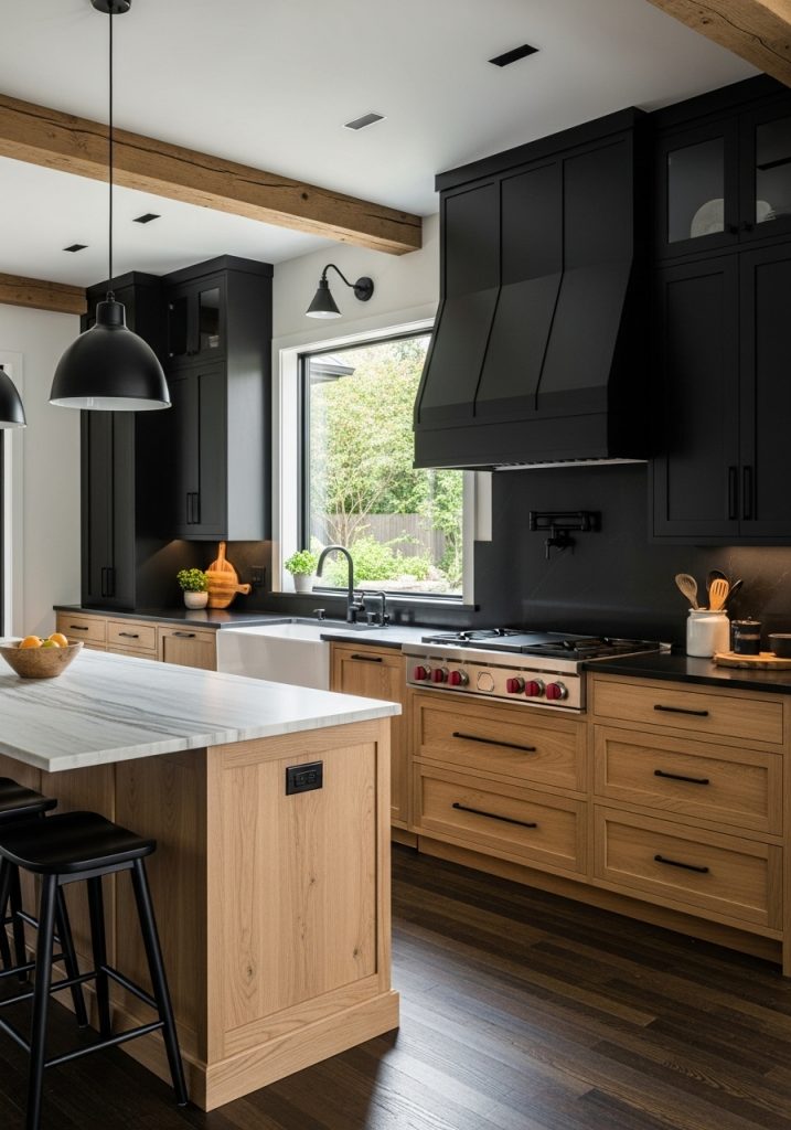 You’ll often find exposed wood beams, farmhouse sinks, and traditional wood textures alongside sleek hardware and matte finishes. The black provides contrast that makes the wood pop, while the wood prevents the black from feeling too heavy or austere. It’s a beautiful balance of texture and tone.