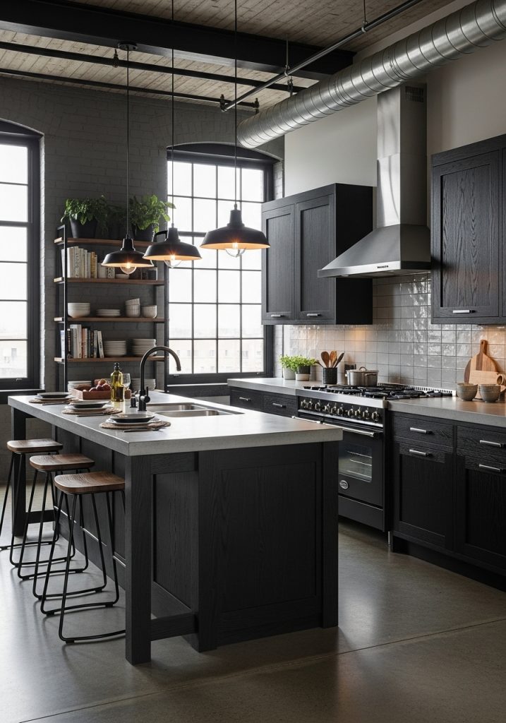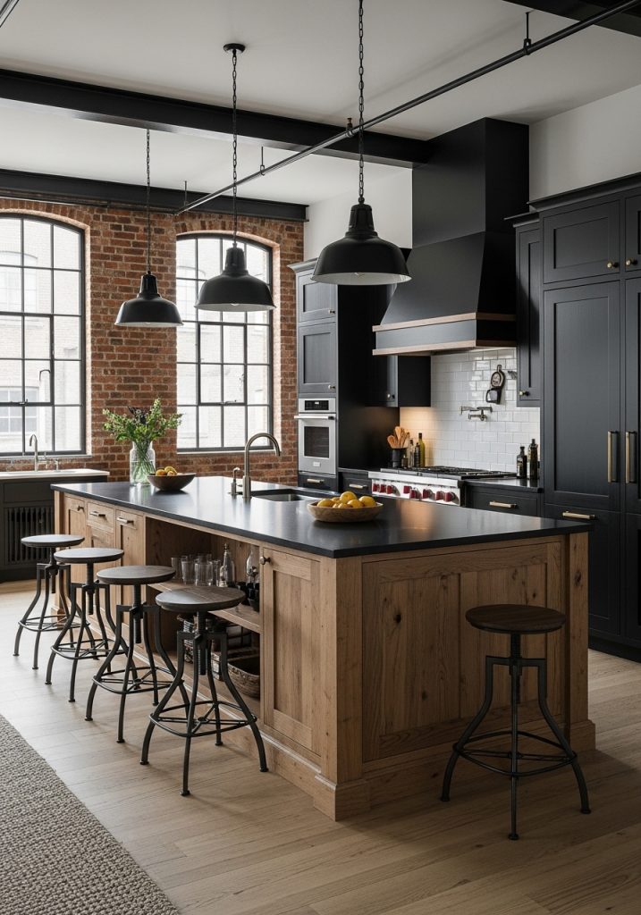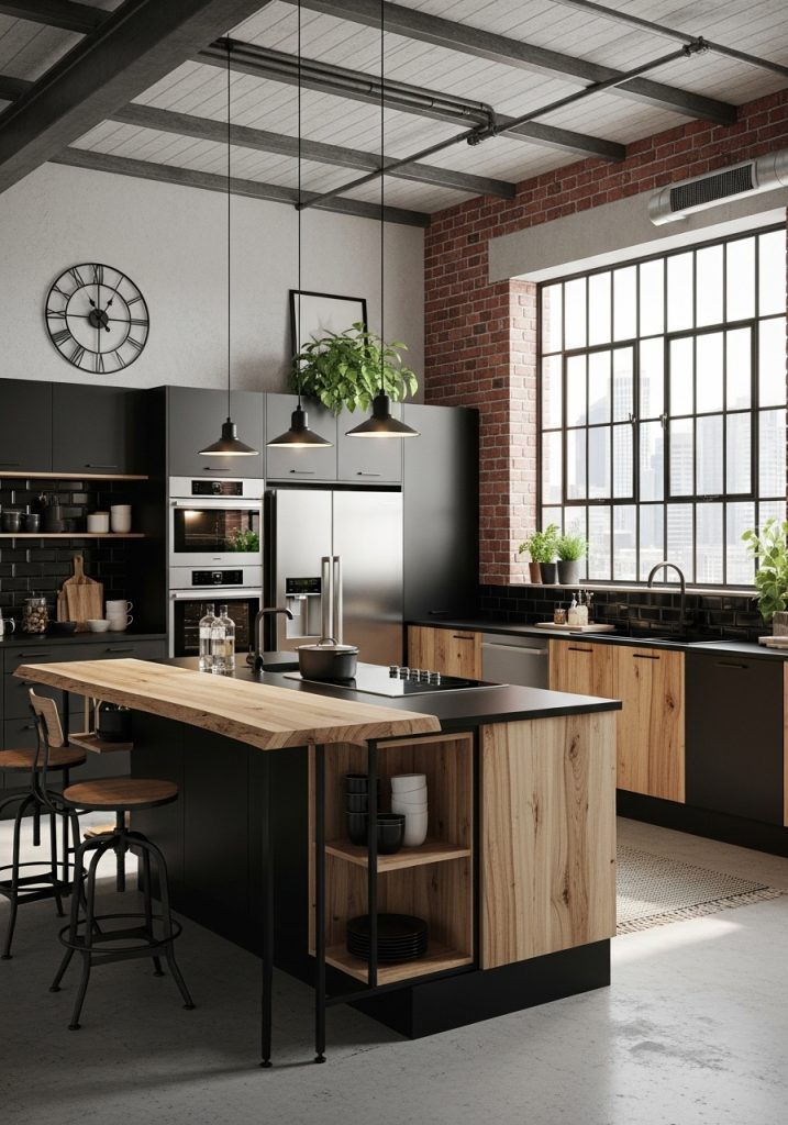 Industrial kitchens are ideal for open-concept living and often feature multifunctional islands that double as dining and prep space. The black and wood palette ensures the space feels cohesive while still maintaining the edgy, unfinished charm that defines the industrial aesthetic.