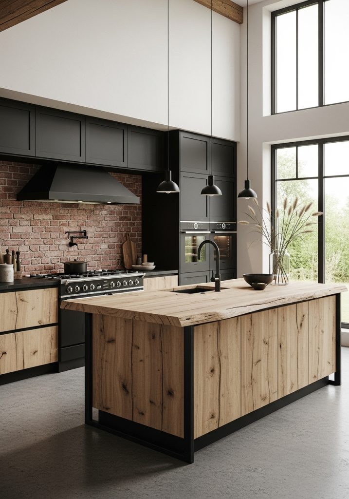 An industrial-style kitchen takes the black and natural wood theme in a more rugged direction. Inspired by warehouse spaces and urban lofts, this design often incorporates raw materials like exposed brick, metal beams, and concrete floors. In this setting, black takes on a bold, dramatic role—frequently used in metal-framed glass cabinets, charcoal countertops, and dark concrete islands. Natural wood offsets the intensity with a tactile and organic feel, often seen in reclaimed wood shelving, rustic dining tables, or butcher block counters.