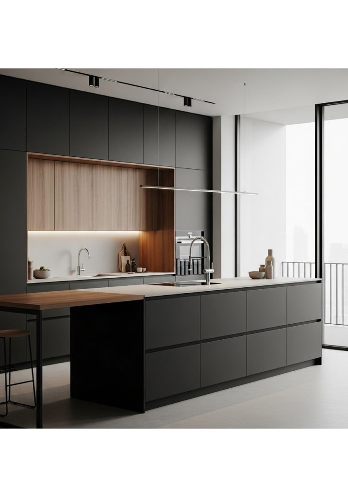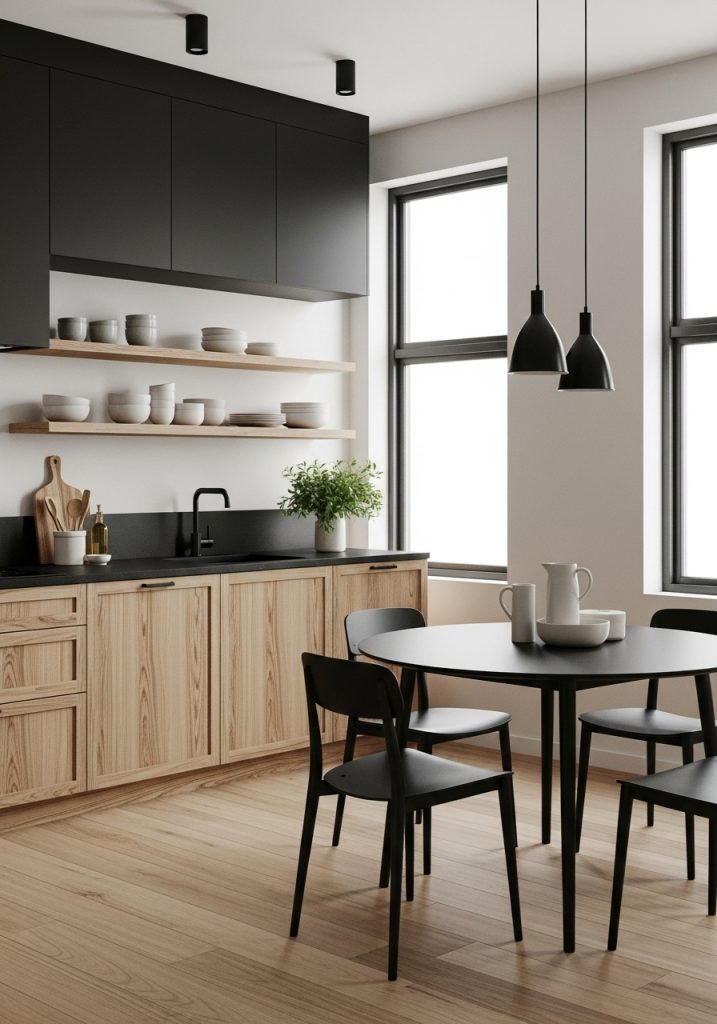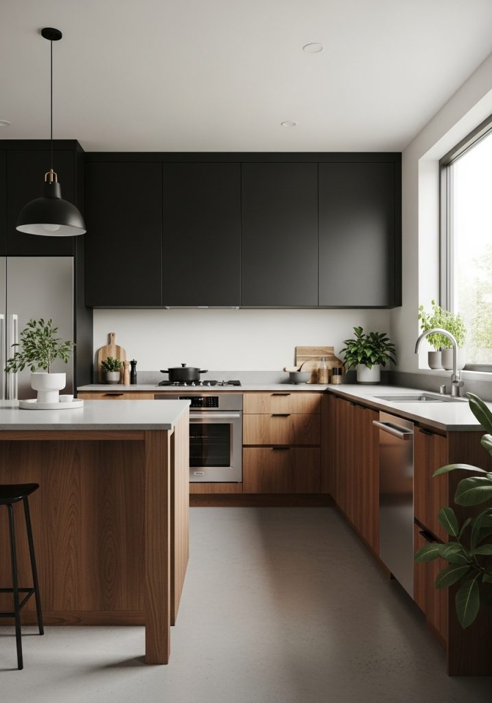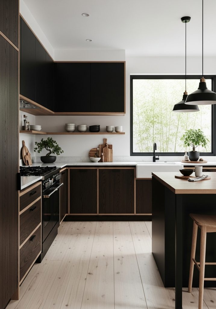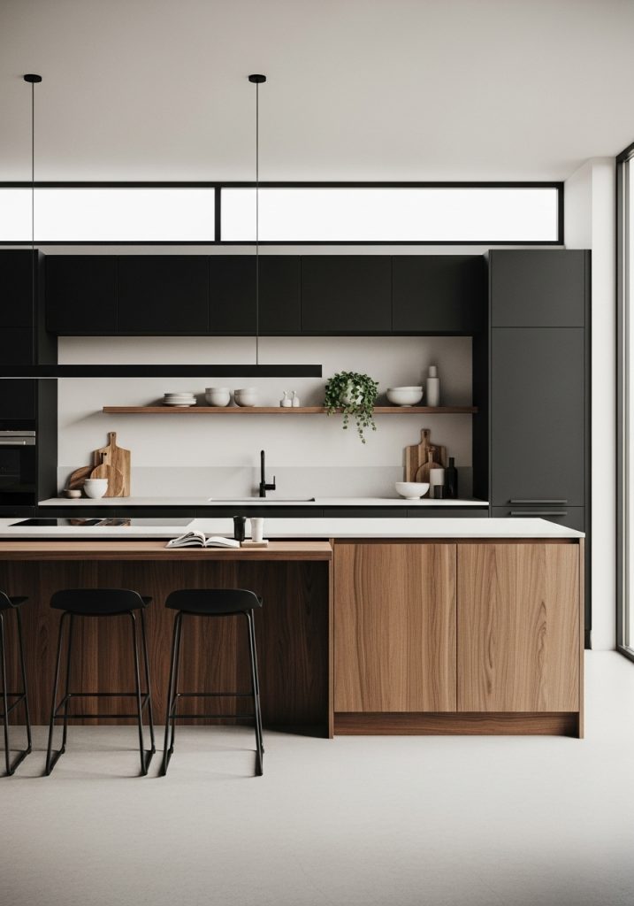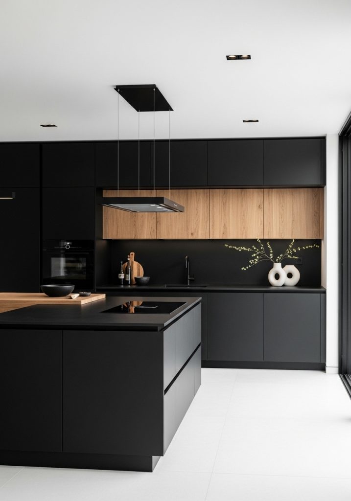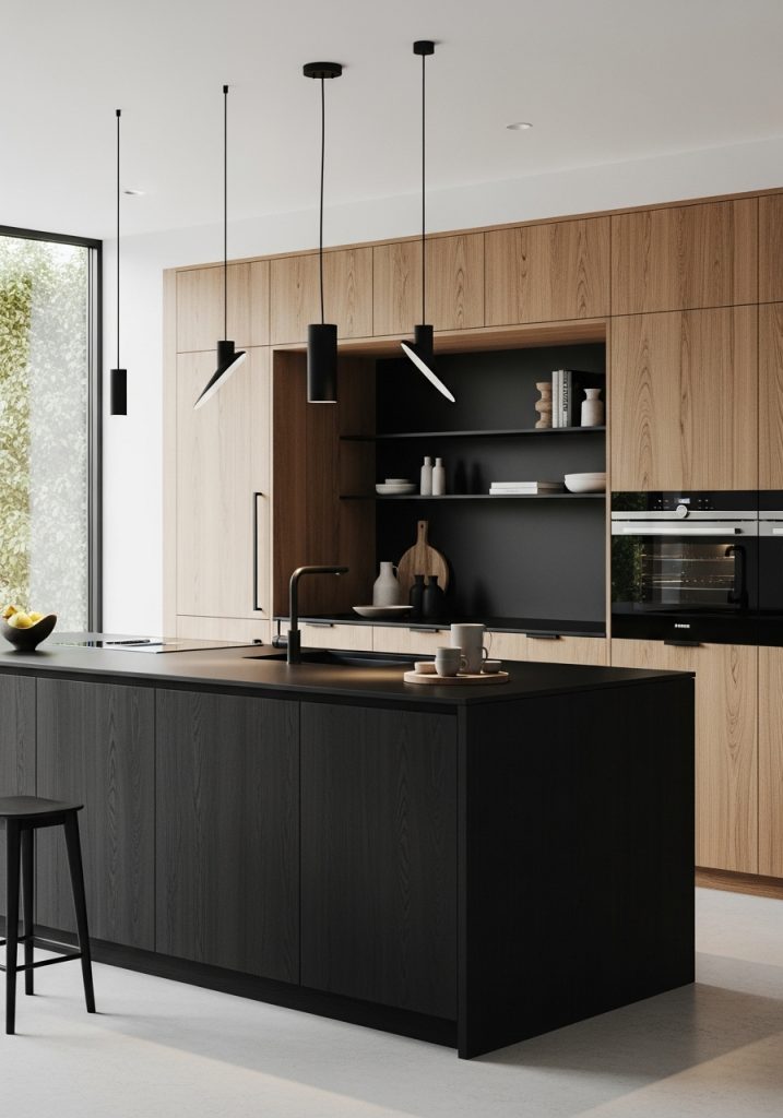 In a modern minimalist black and natural wood kitchen, less is always more. This design style embraces sleek surfaces, integrated appliances, and a clean, uncluttered look. The black elements—often seen in flat-front cabinetry or matte black hardware—bring a crisp edge, while the wood softens the effect, offering warmth and texture without overwhelming the space. Think of cabinetry in smooth black laminate paired with pale oak open shelves or a butcher block countertop that breaks up the darkness with earthy contrast.