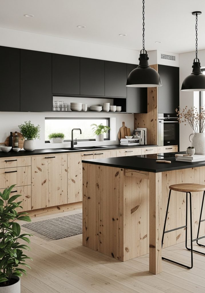 The emphasis here is on creating a calm and cozy space that still feels fresh and modern. Lighter wood tones such as birch, pine, or beech give the space an airy feel, while black accents ground the design. You might see wide plank wood floors paired with matte black cabinetry, or a natural wood ceiling offset by black pendant lights. The combination is perfectly balanced—clean and functional with a touch of hygge.