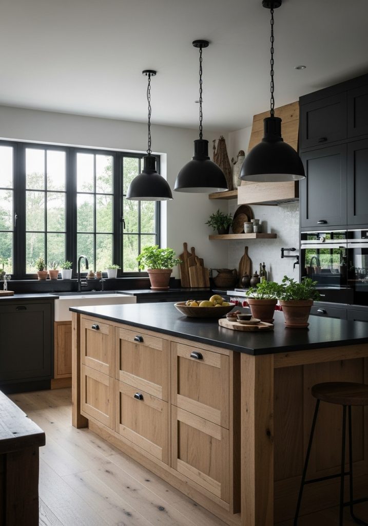 For those who love a bit of the old with the new, the rustic contemporary black and natural wood kitchen brings together charm and polish. This design style takes the raw beauty of rustic wood—like knotty pine, oak, or walnut—and pairs it with modern black cabinetry, countertops, or light fixtures for a fresh, updated feel.