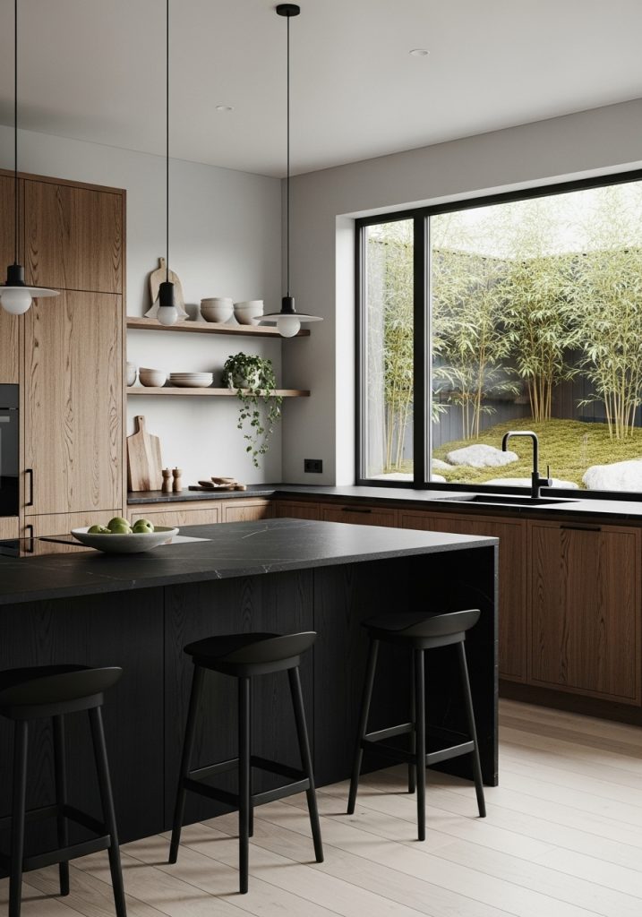 Japandi is the serene fusion of Japanese minimalism and Scandinavian functionality—and it works beautifully with a black and natural wood kitchen design. This style favors simplicity, clean lines, and a muted color palette. In Japandi kitchens, black often appears in accent pieces like minimal cabinetry, fine-edged shelving, or minimalist fixtures. The natural wood comes in soft, neutral tones that evoke tranquility and harmony.