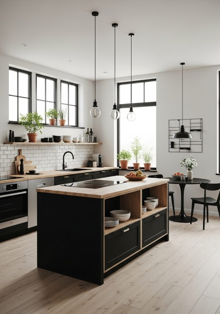 If you love functionality paired with cozy design elements, a Scandinavian black and natural wood kitchen might be your perfect match. This design embraces natural light, simplicity, and a deep connection to materials. Black is used sparingly—often in the form of lower cabinets or a sleek backsplash—while natural wood takes center stage with open shelving, slatted wood panels, or exposed beams.