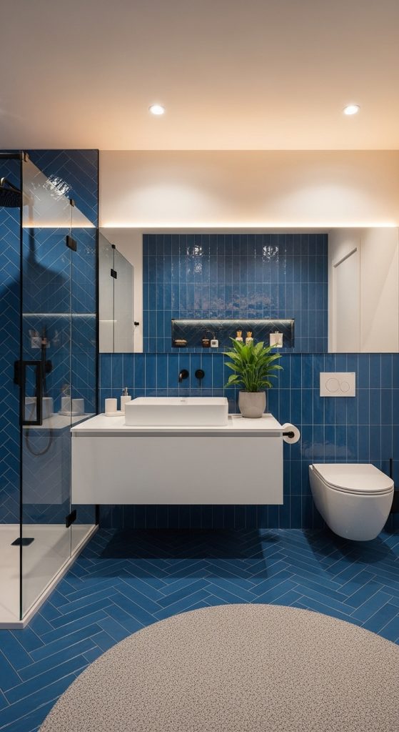 Using blue tile from floor to ceiling can create a cohesive and immersive effect. This approach works especially well in showers or smaller bathrooms where visual continuity makes the space feel larger.