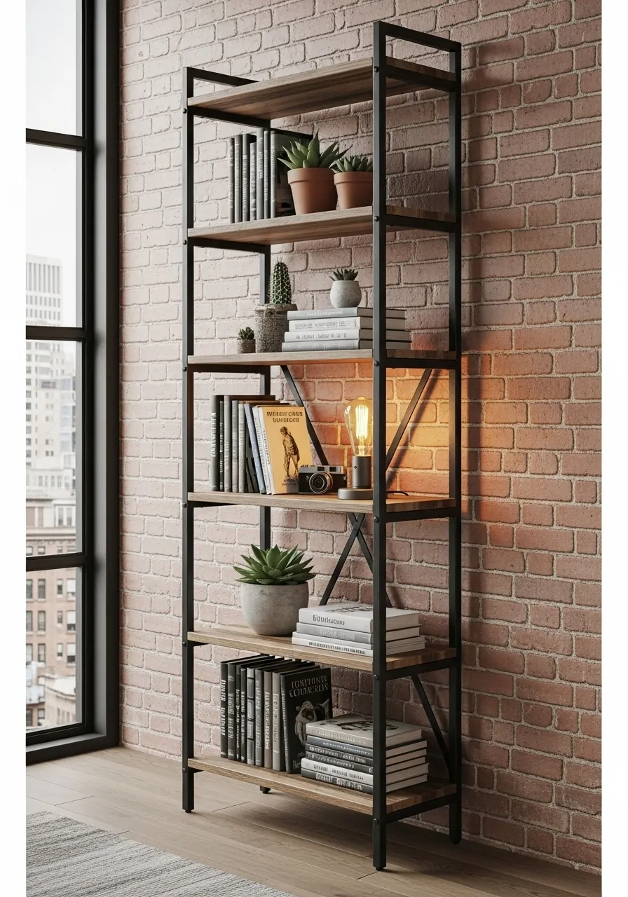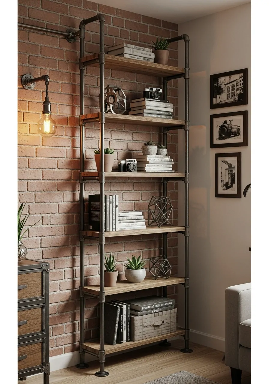 Industrial bookshelf ideas bring a raw, urban edge to small interiors. Think black metal frames, distressed wood planks, and exposed brackets. This style is particularly effective in small apartments or converted lofts, where structural elements like brick or concrete walls are part of the design. Industrial shelves are all about contrast — they feel sturdy and grounded but can be designed in ways that don’t overwhelm tight quarters.