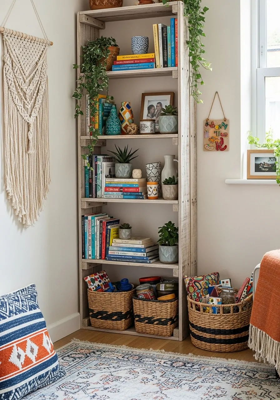 Bohemian style embraces creativity, warmth, and a touch of whimsy — and it’s a perfect match for compact living. When designing boho bookshelves for small spaces, think natural materials, layered textures, and eclectic touches. Wicker, rattan, and raw wood shelves instantly add warmth and character. Look for leaning ladder-style shelves, open-back designs, or circular wall-mounted options that make a statement while staying space-efficient.