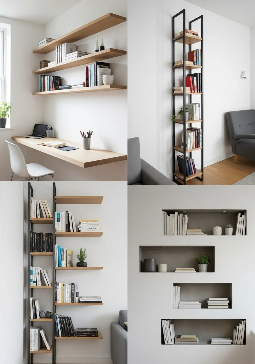 In minimalist spaces, every object must earn its place — and bookshelves are no exception. Minimalist bookshelf ideas for small spaces revolve around clean lines, open air, and the principle of “less is more.” Instead of bulky furniture, opt for slim wall-mounted shelves that blend seamlessly into the background. Floating shelves made of light wood or neutral-toned metal create the illusion of space while still offering practical storage. When arranged in a vertical stack, they guide the eye upward, making the room appear taller and more open.