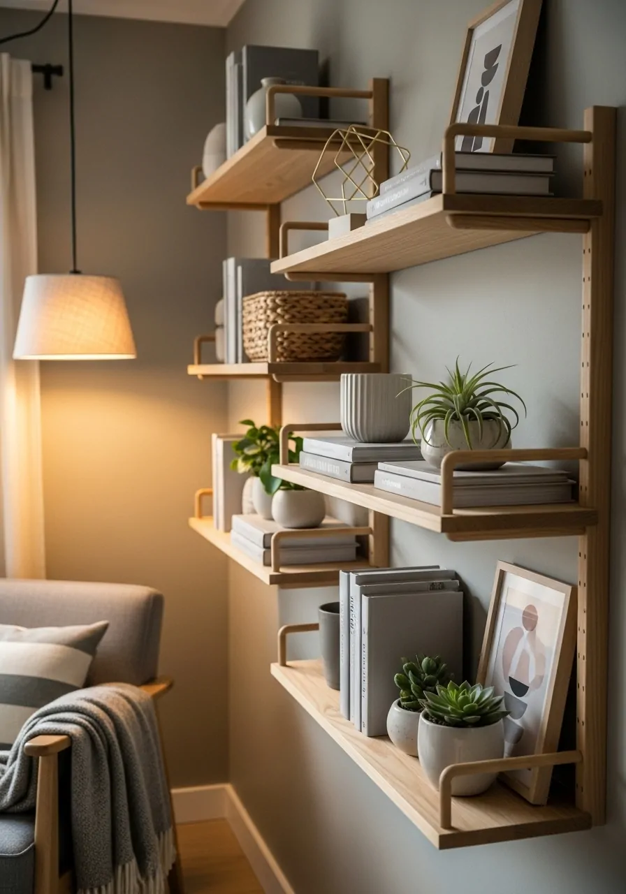 Scandinavian design is beloved for its simplicity, warmth, and practicality — all perfect qualities for small-space living. When it comes to bookshelf ideas for small spaces, the Scandi approach focuses on light wood tones, soft neutrals, and an overall airy feel. Wall-mounted shelves with open designs keep things looking light, while low-profile standing shelves help ground the space without adding bulk.