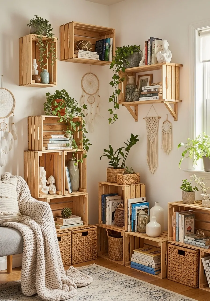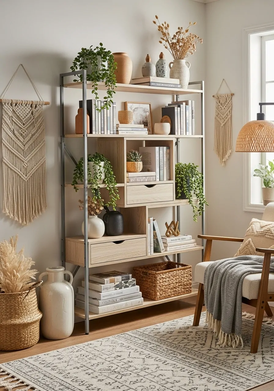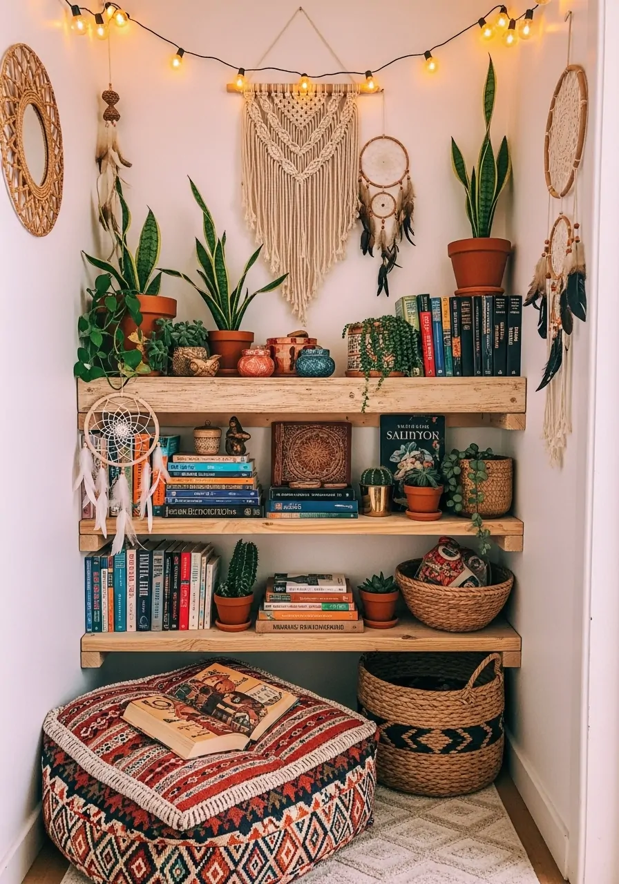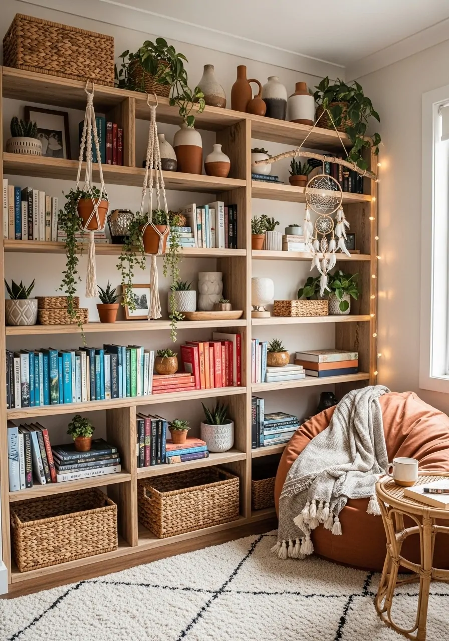Boho bookshelves also work well in unconventional spaces. A tiny reading nook, a hallway corner, or even a bathroom can take on boho vibes with the right shelf styling. The key is layering — books, plants, textiles, and found objects all living together in cozy harmony.