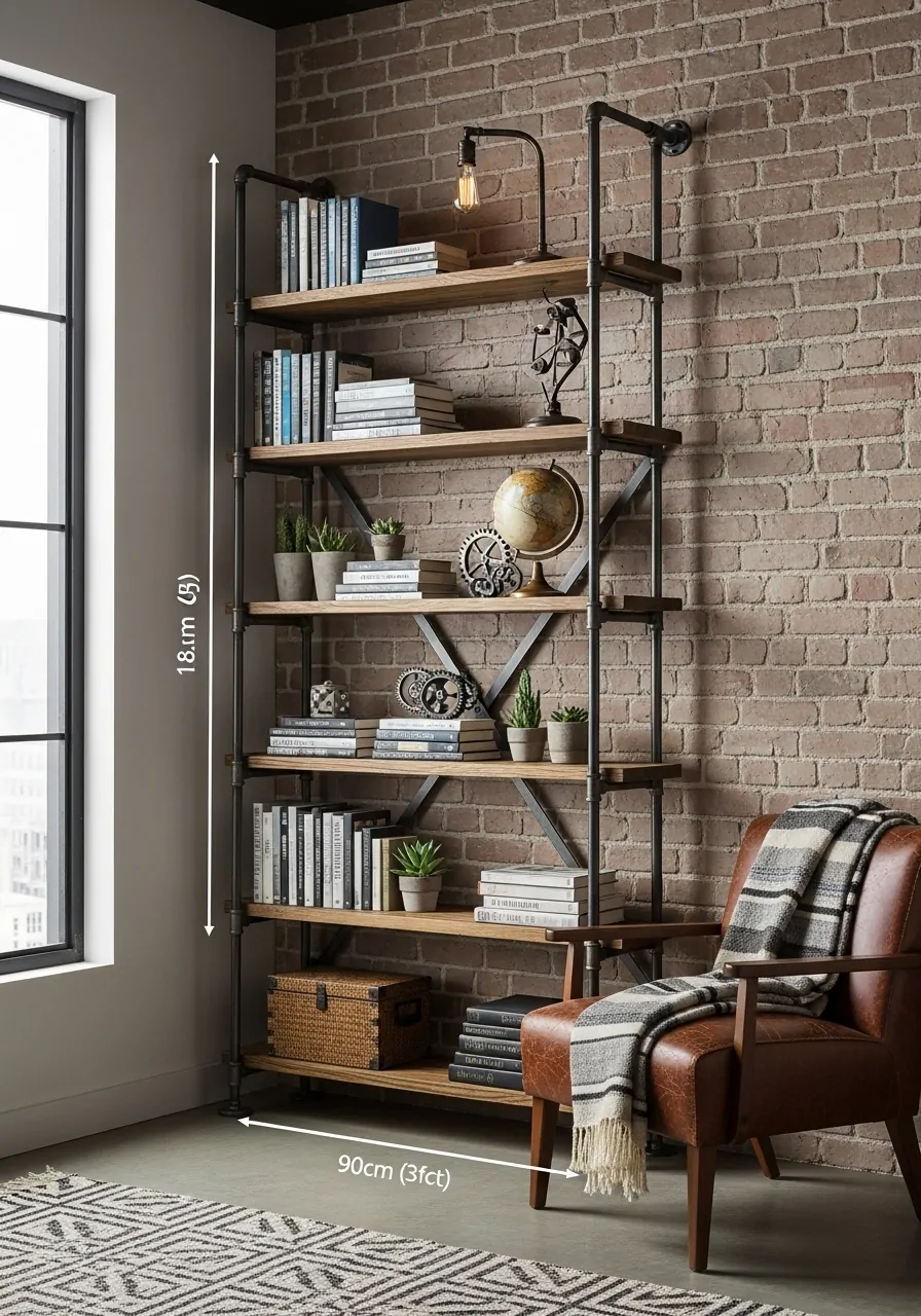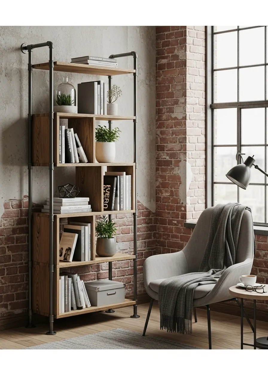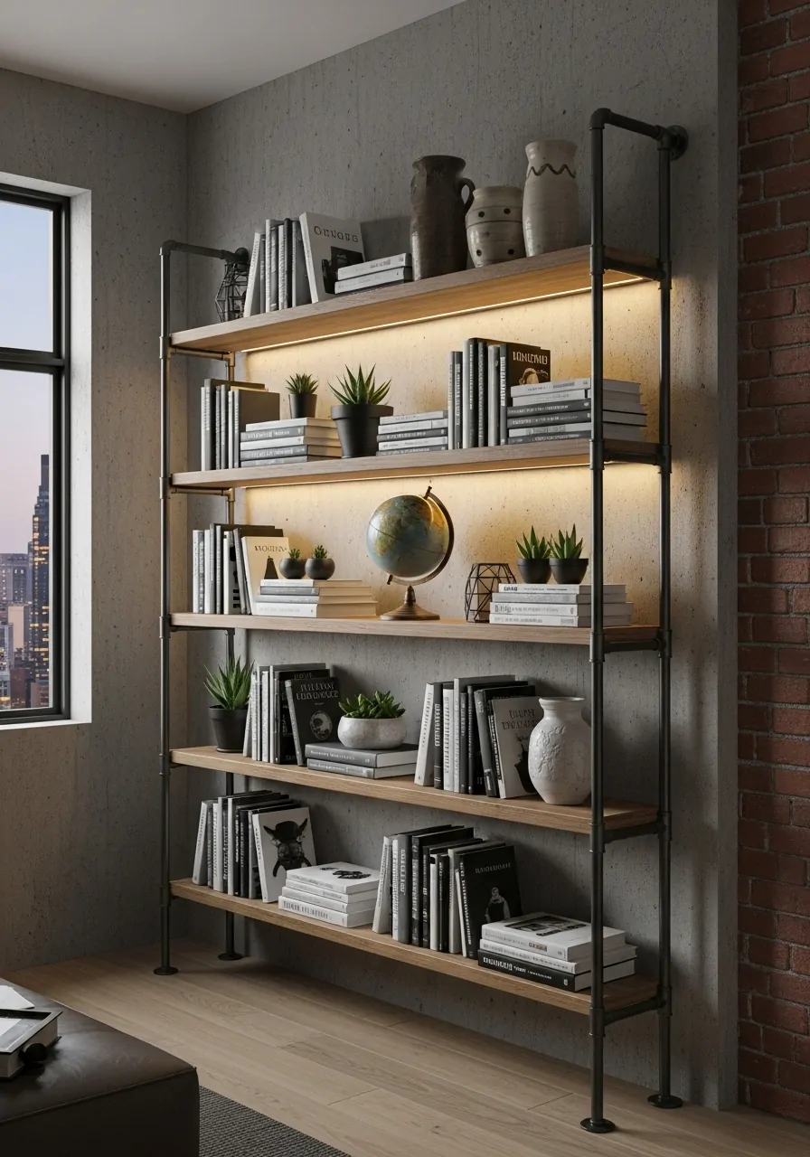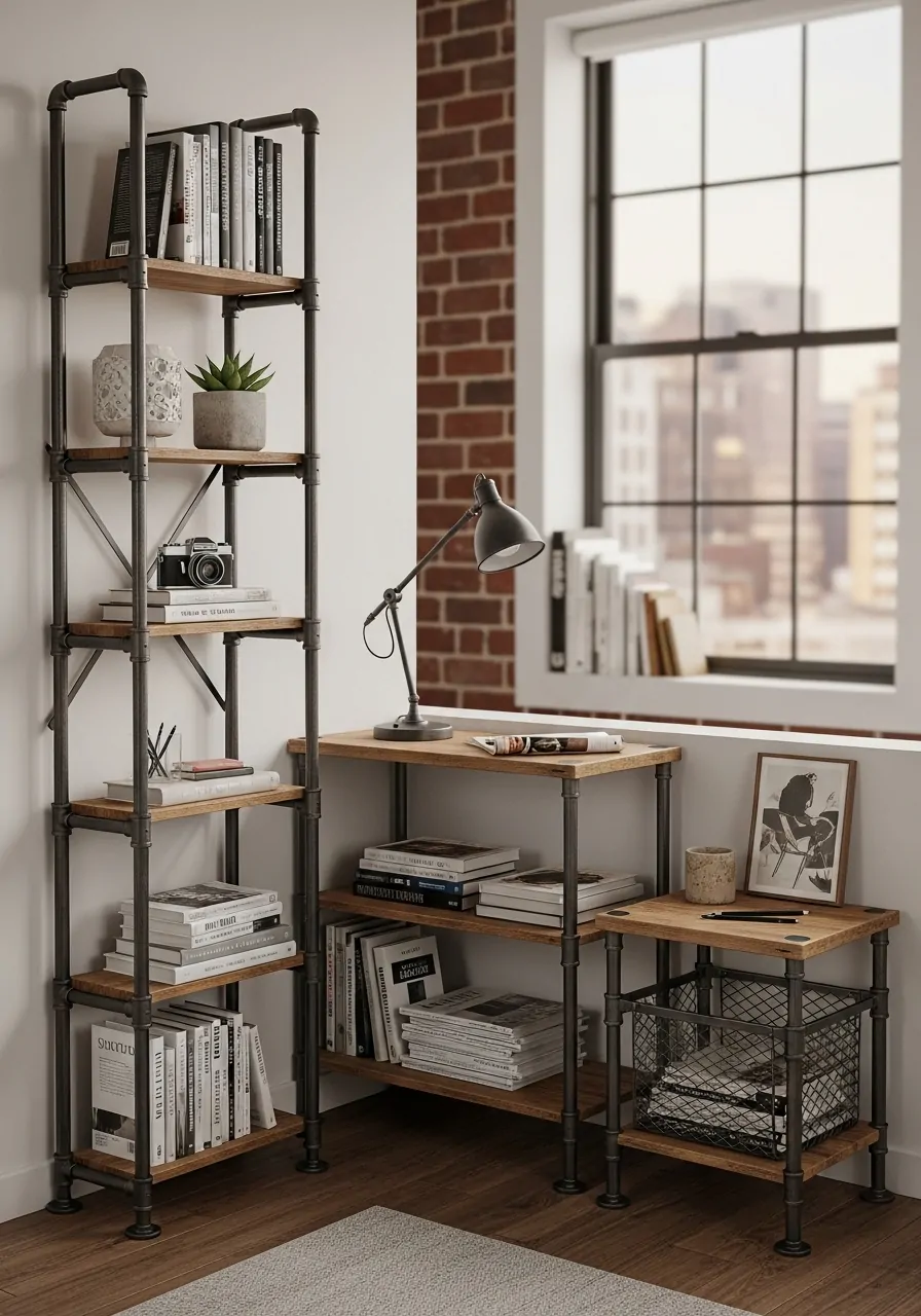 Wall-mounted pipe shelving is a popular industrial option that saves floor space while making a bold statement. These shelves can run from floor to ceiling, transforming an otherwise empty wall into a dramatic focal point. If you’re furnishing a home office or a compact living room, a modular metal-and-wood bookshelf unit allows for maximum flexibility while keeping the style cohesive.