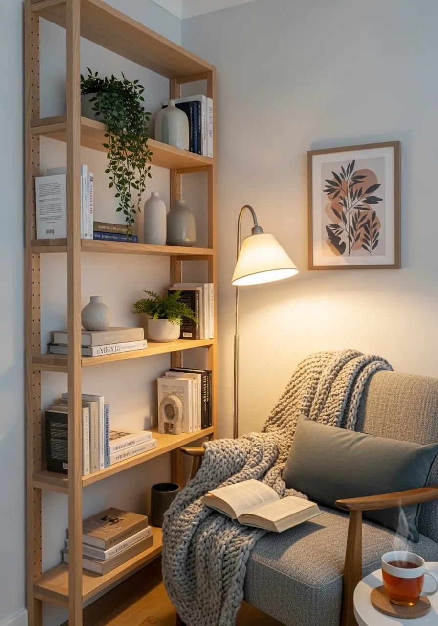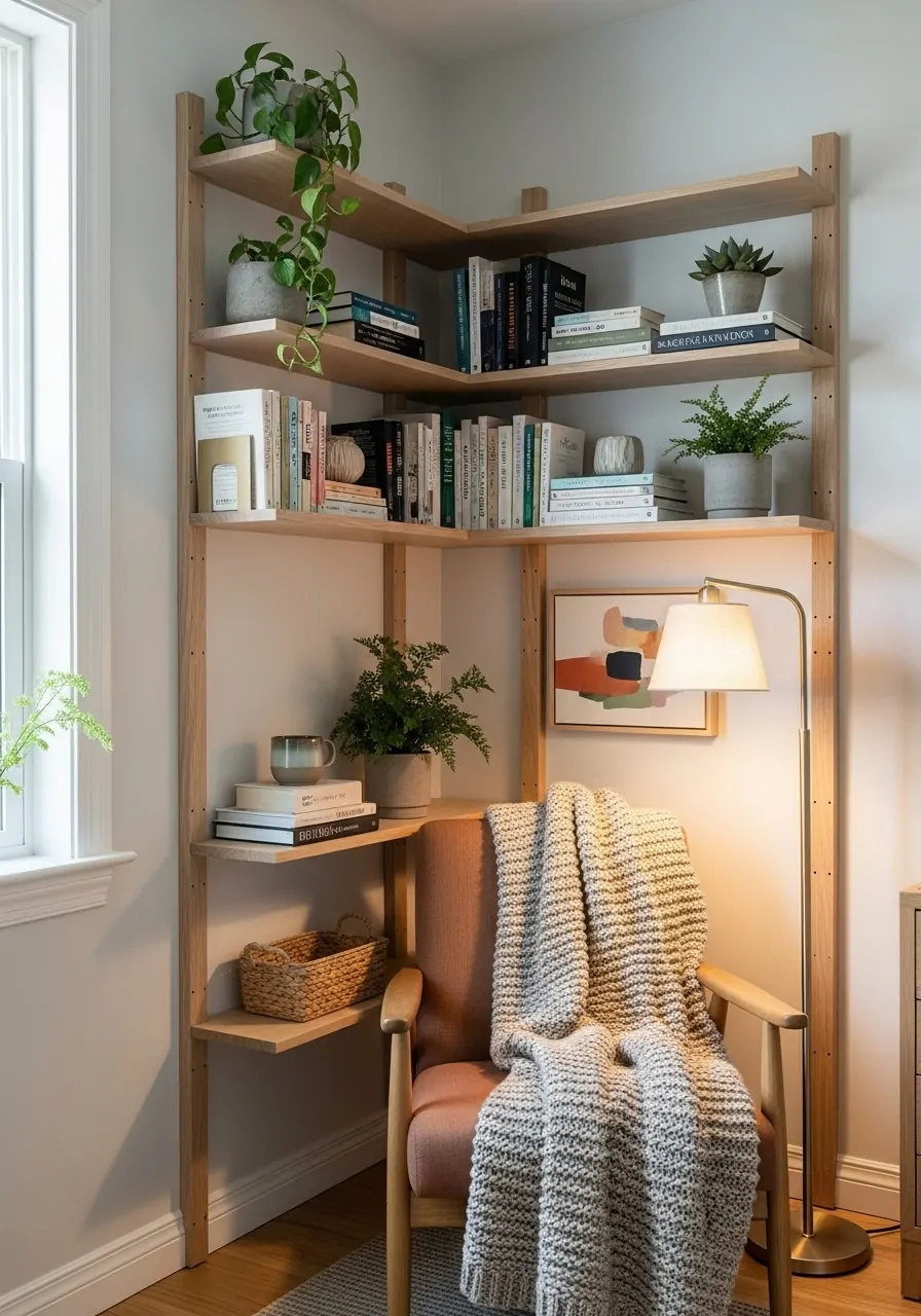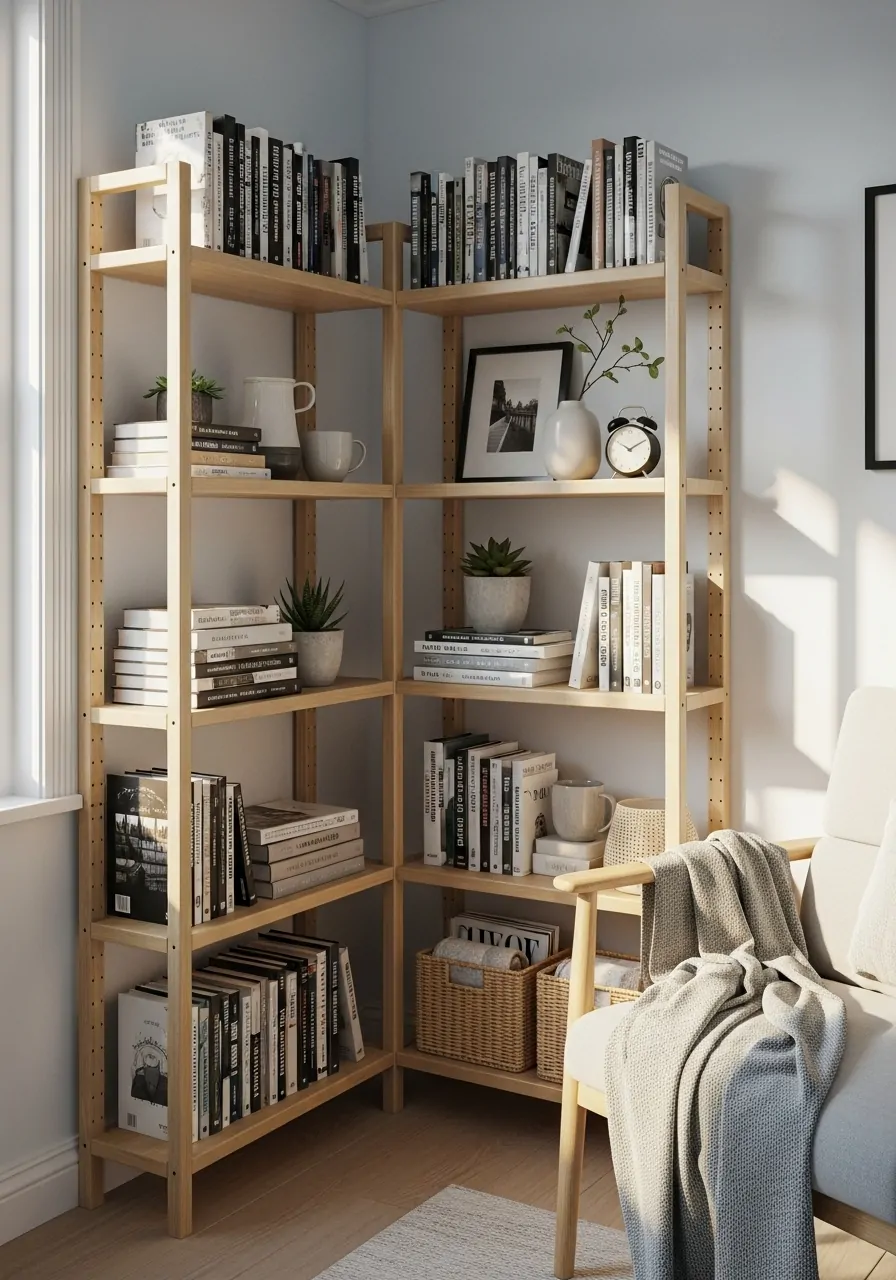 In tight corners, consider using staggered shelves that create movement while staying compact. For smaller bedrooms or offices, a floating corner bookshelf makes great use of typically underutilized space. Scandinavian design also pairs well with multi-functional furniture — think benches with built-in cubbies or desks that incorporate vertical shelving. These hybrids help maximize storage without sacrificing aesthetic appeal.