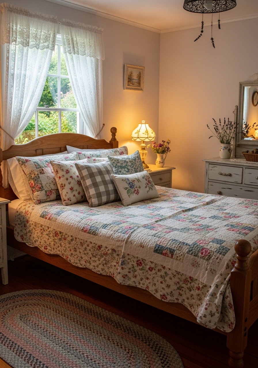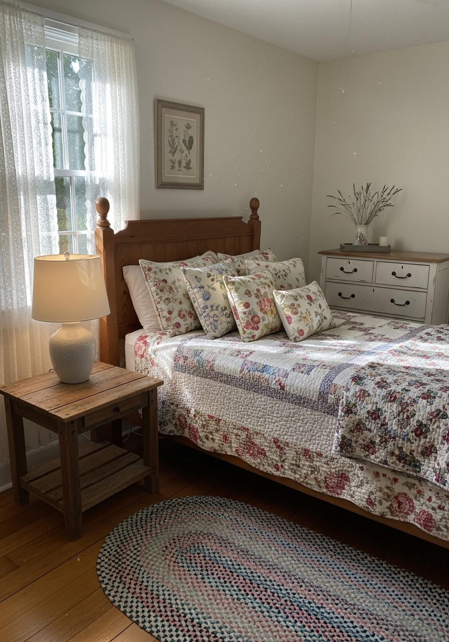 When it comes to cottage bedroom ideas, artisan craftsmanship shines through in the accessories. The image showcases a cozy bedroom filled with handmade items that add warmth and character. Each piece tells a story, reflecting the skill and creativity of its maker.