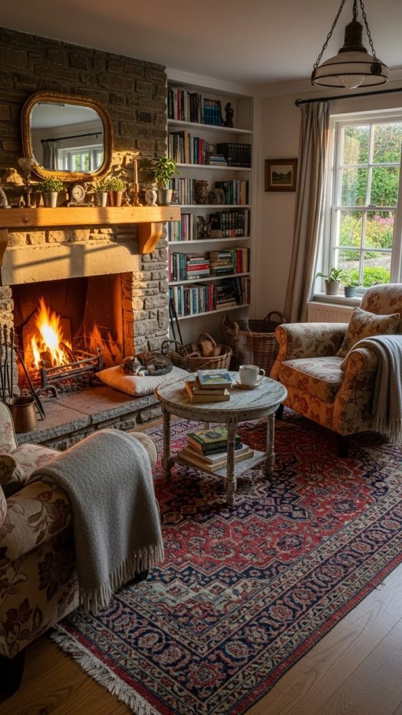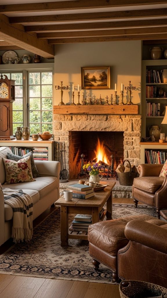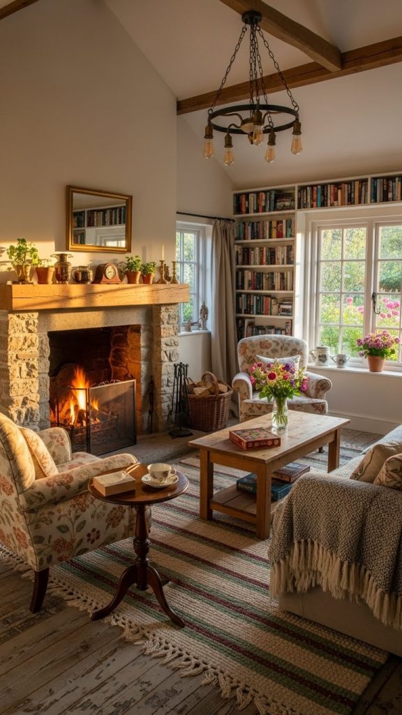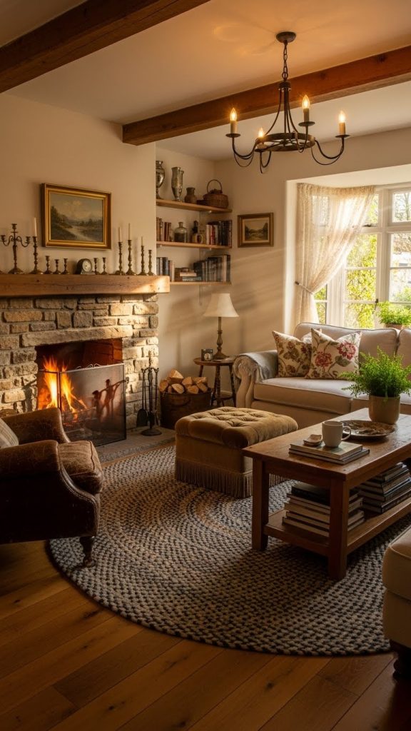 Fireplaces are often the heart of a cottage living room. They draw people in, creating a cozy spot to gather. The image shows a beautifully crafted stone fireplace, with a warm fire crackling inside. This setup invites relaxation and conversation.