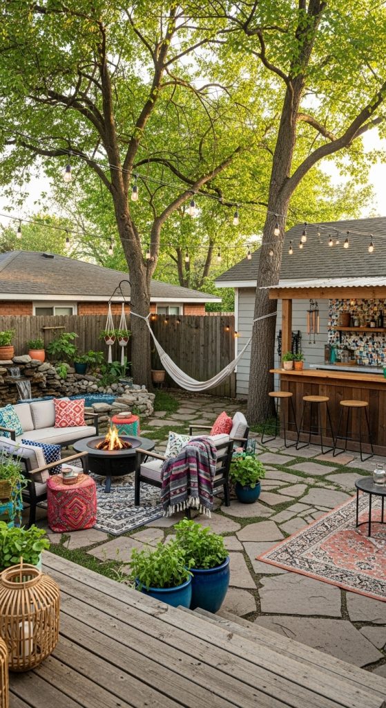 A hammock corner is a perfect spot to unwind in your backyard. Picture a cozy hammock strung between two sturdy trees, inviting you to take a break. The soft cushions add comfort, making it an ideal place to relax with a book or enjoy a nap.