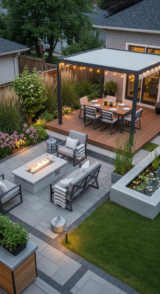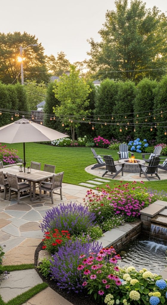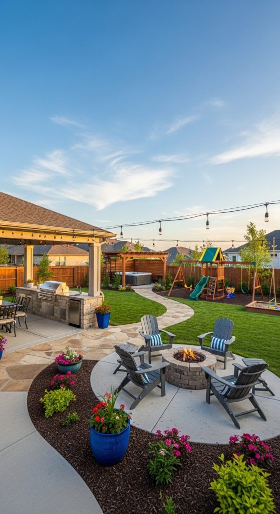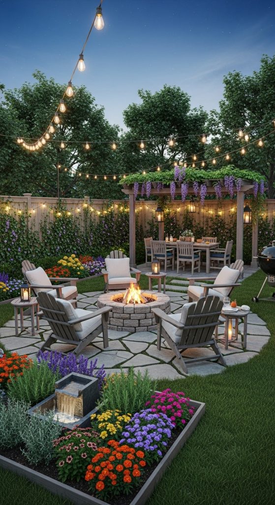 String lights overhead create a soft glow, enhancing the inviting feel of the space. This lighting not only adds charm but also makes the area usable after sunset. Whether you’re roasting marshmallows or sharing stories, this fire pit area is a great way to enjoy your backyard.