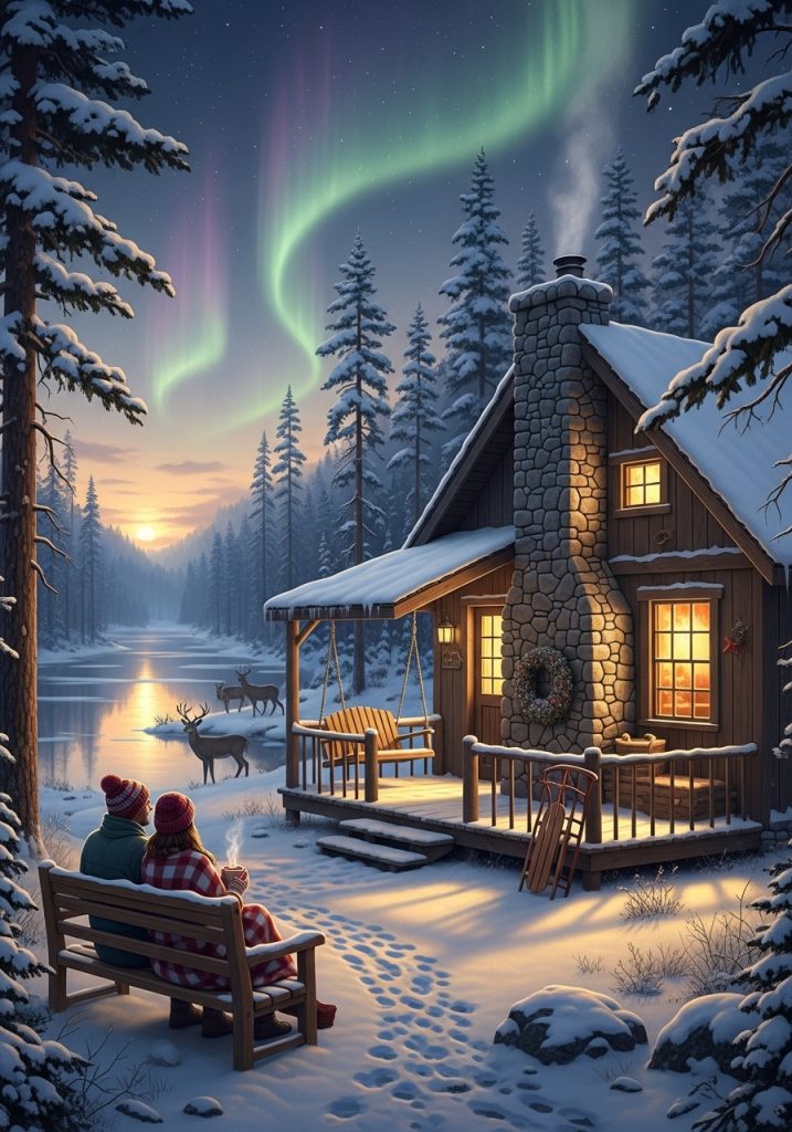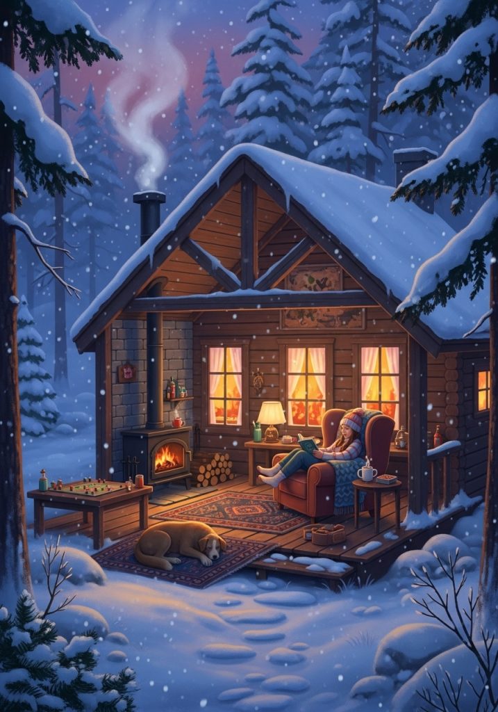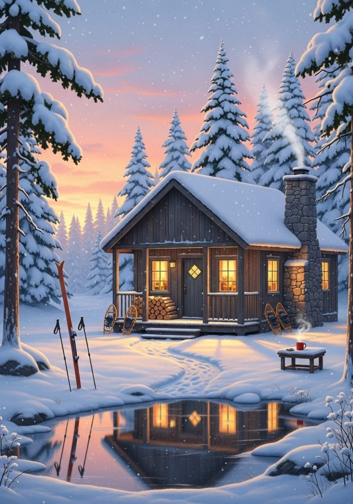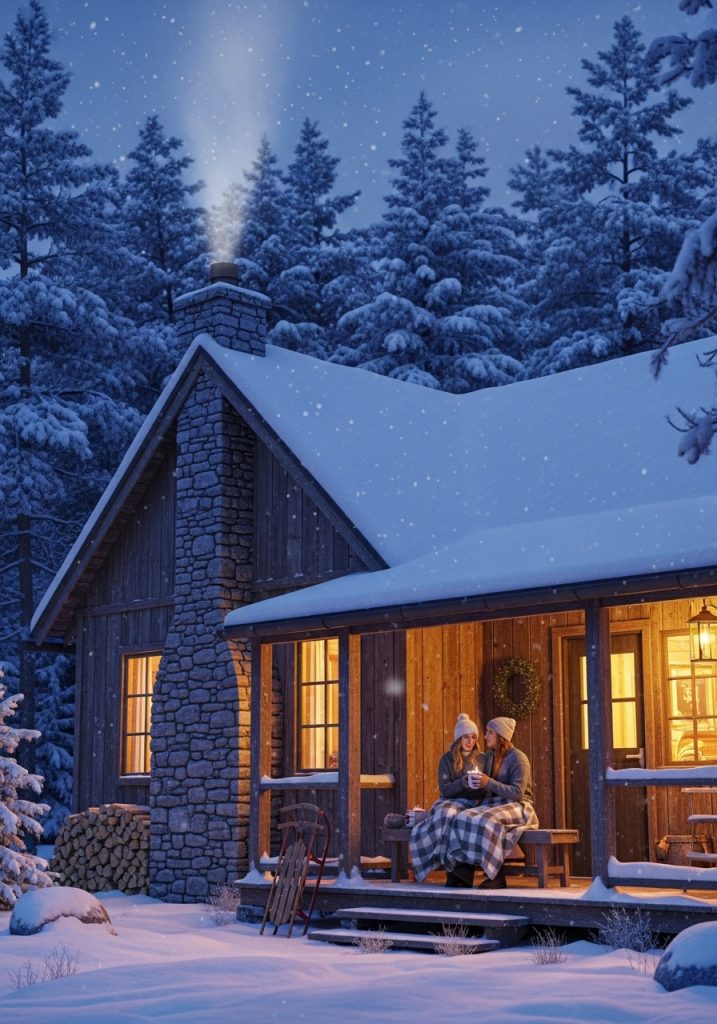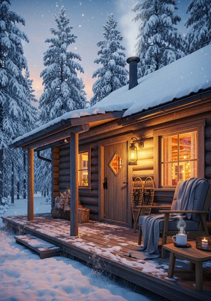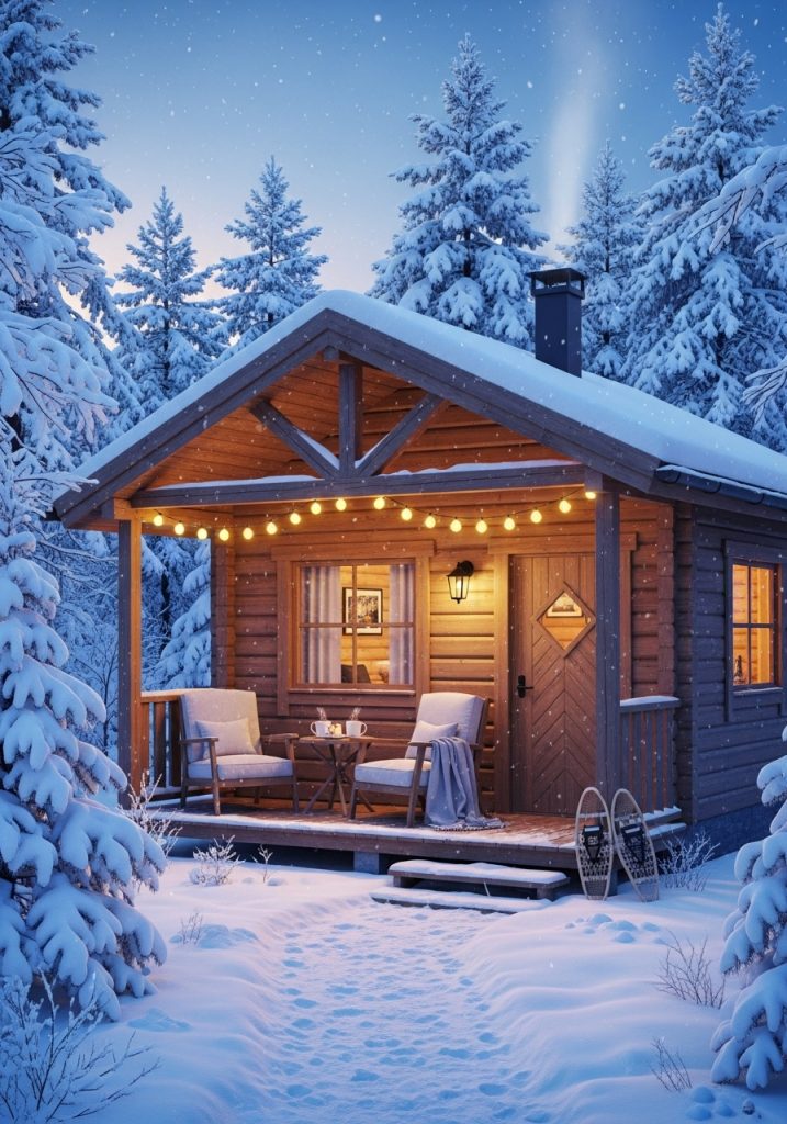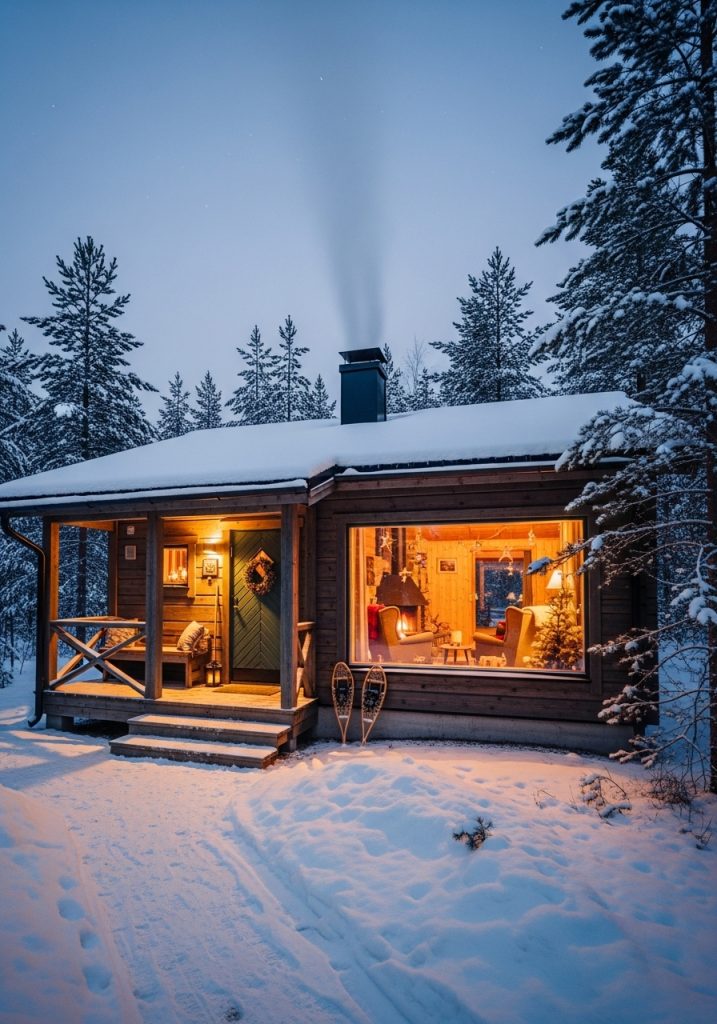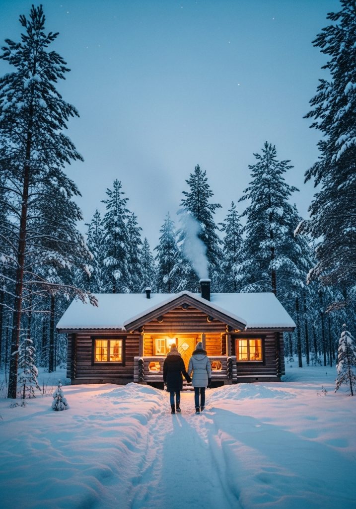 Imagine a cozy cabin surrounded by tall, snow-covered trees. The warm glow from the windows invites you in, making it the perfect spot to escape the hustle of daily life. This scene captures the essence of a secluded mountain retreat.
