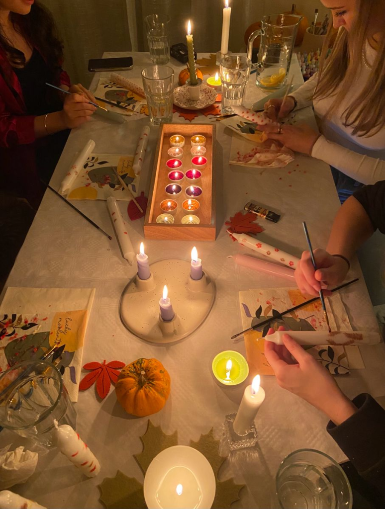 A candle painting setup instantly makes a craft night feel warm and dreamy. Grab plain taper candles or pillar candles and let everyone decorate them with soft florals, tiny stars, abstract swirls, or cute little doodles.
