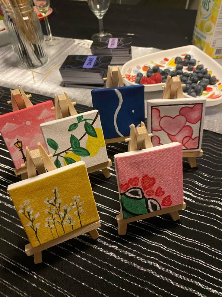 Tiny canvases make painting feel less intimidating and way more fun. People can paint sunsets, abstract art, flowers, little landscapes, or even funny inside jokes from the friend group.