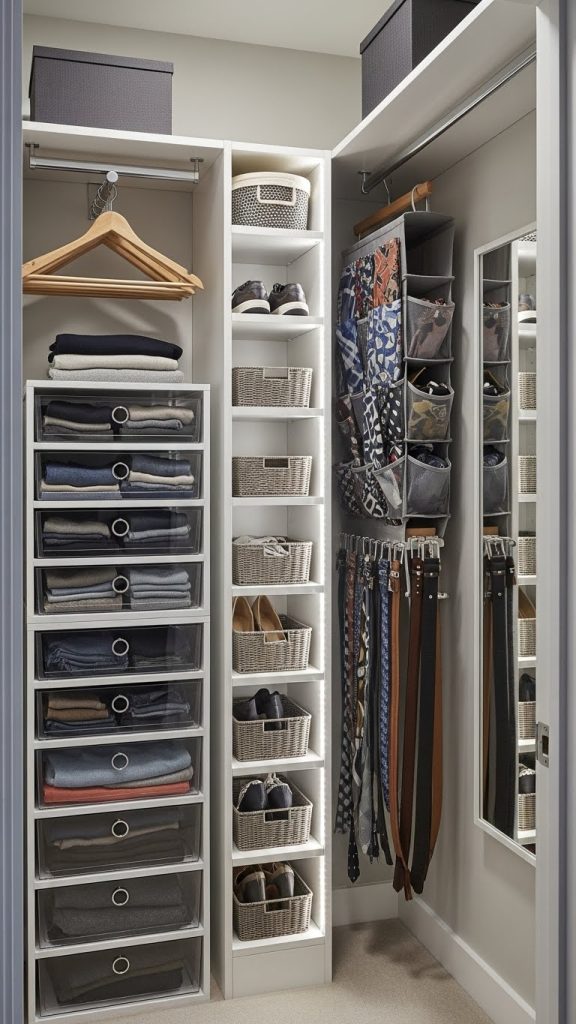 Consider using baskets in different colors or materials to match your decor. This way, your closet can be both functional and aesthetically pleasing.
