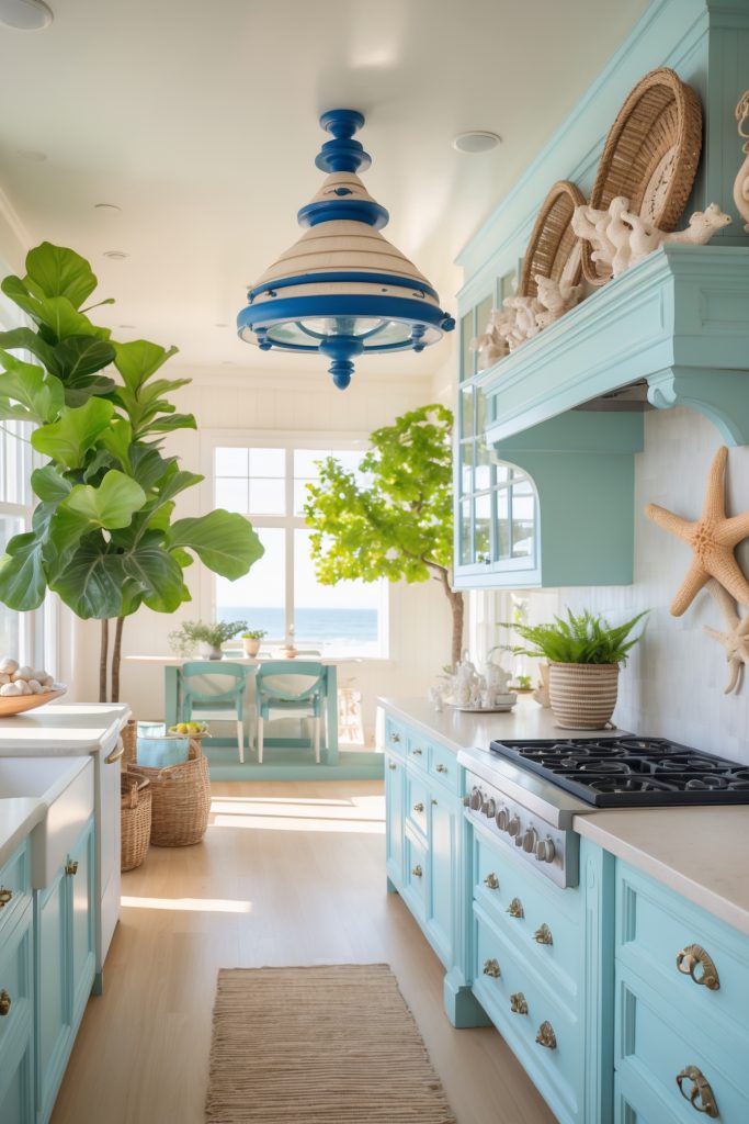 Incorporate a soothing palette of light blues, whites, and sandy beiges. Nautical touches like rope decor and glass pendant lights create a breezy seaside atmosphere.