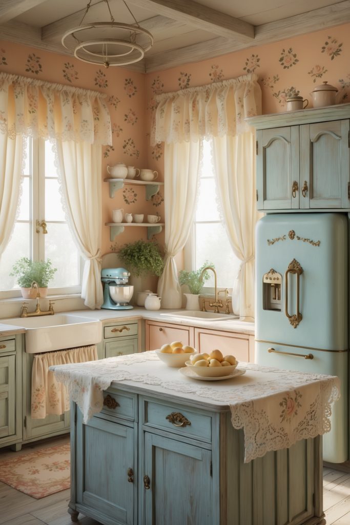 Floral curtains, antique touches, and a warm color palette make this one feel like home. Add a teapot on the stove for extra charm.