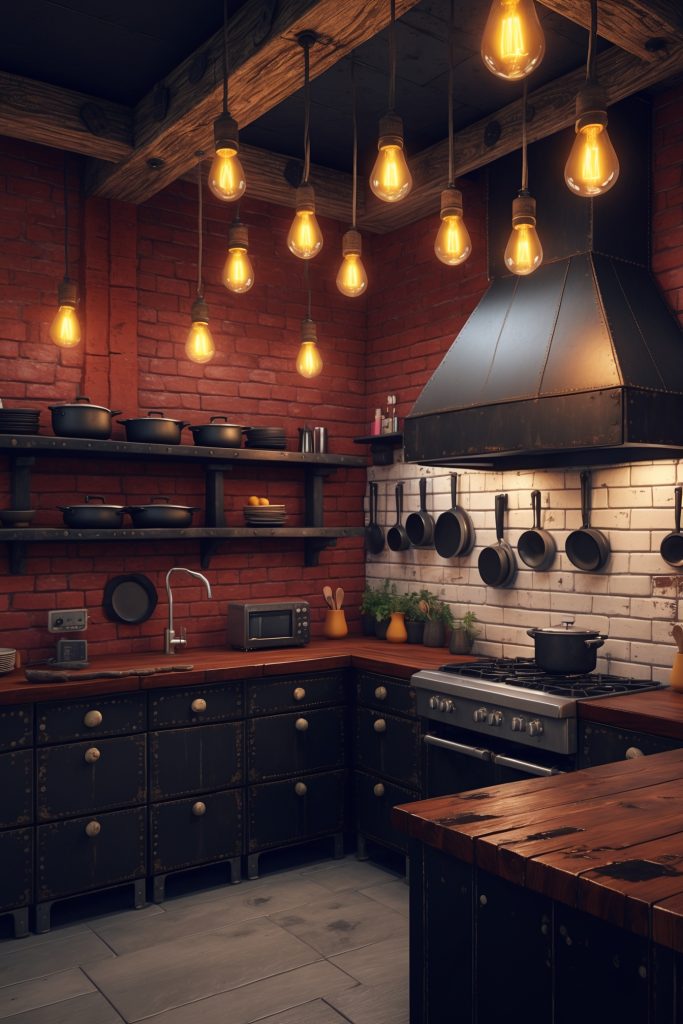 Combine raw materials like metal, exposed brick, and dark wood for a trendy, edgy feel. Pendant lighting and visible pipes complete this urban aesthetic.