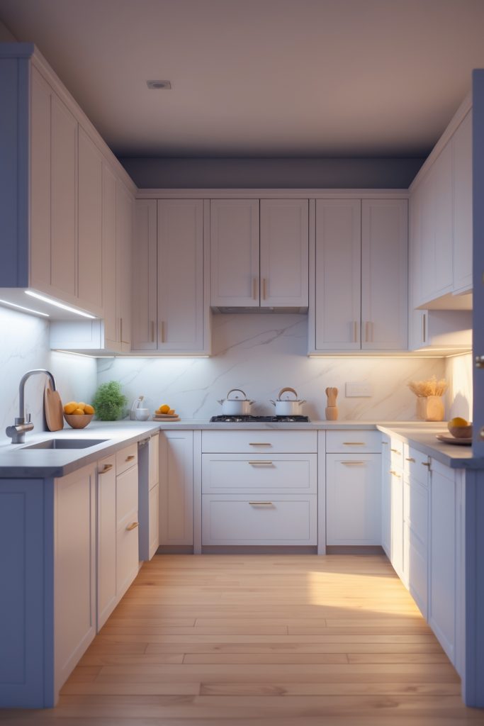 A clean, clutter-free kitchen featuring crisp white cabinets, sleek countertops, and soft ambient lighting. Perfect for modern Bloxburg homes that prioritize simplicity and elegance.
