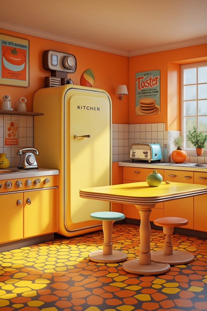 Throw it back with bold colors, round-edged cabinets, and funky floor patterns. Great for unique builds.