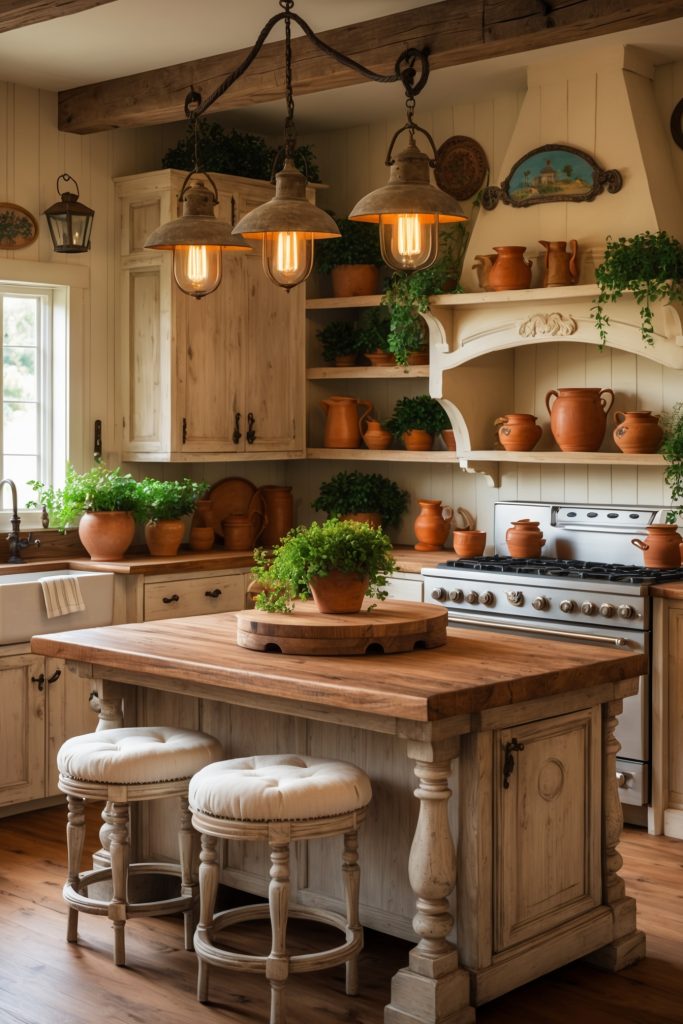 Channel cozy country vibes with exposed wooden beams, distressed wood surfaces, and vintage decor. Open shelving and a retro stove add authentic farmhouse character.