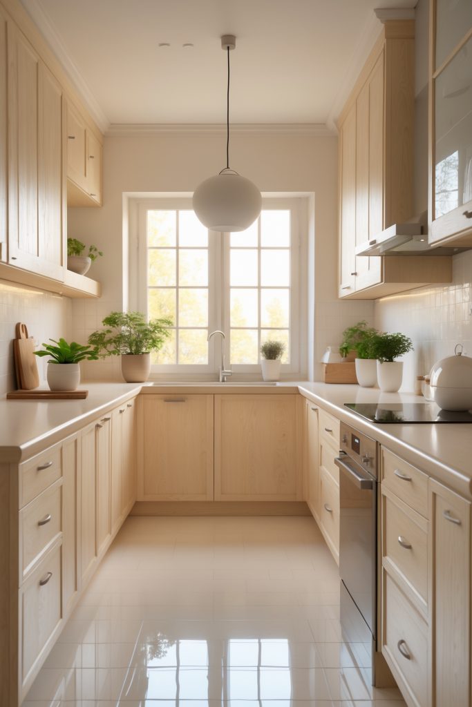 Focus on natural woods, neutral tones, and smart storage solutions. This kitchen balances cozy warmth with efficient functionality.