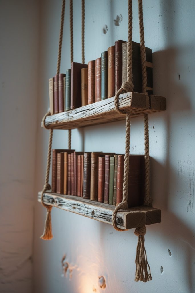 Create a boho-inspired bookshelf using wooden planks and strong rope. Suspend them from the ceiling or mount them to the wall for a lightweight yet functional design.