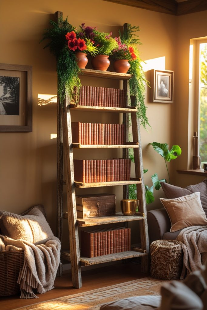 Repurpose an old ladder into a stylish bookshelf. Attach wooden planks across the rungs to create sturdy shelves. This is a perfect idea for a farmhouse or vintage-style home.