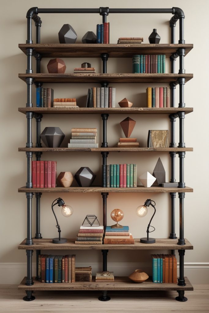 For an industrial look, use metal pipes and wooden planks to create a durable, trendy bookshelf. Secure the pipes to the wall for a sturdy structure and customize the shelf lengths to fit your space.
