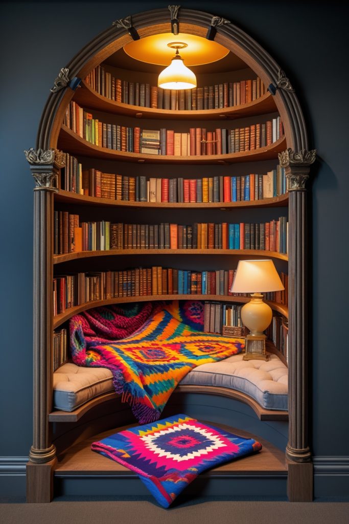 Maximize unused corners by building custom corner bookshelves. Use floating shelves, a triangular frame, or stacked crates to create a functional and stylish space.