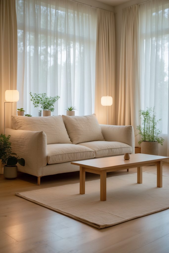 A Japandi living room merges Japanese simplicity with Scandinavian warmth, creating a tranquil and clutter-free space.