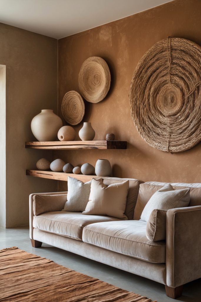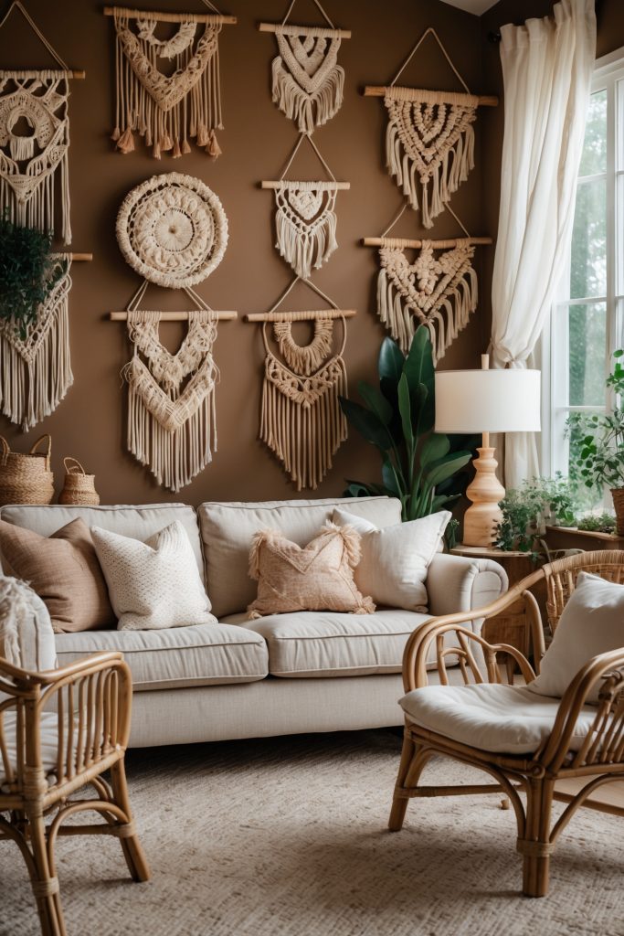 A boho-inspired neutral living room brings together earthy tones and layered textures for a relaxed, eclectic vibe.