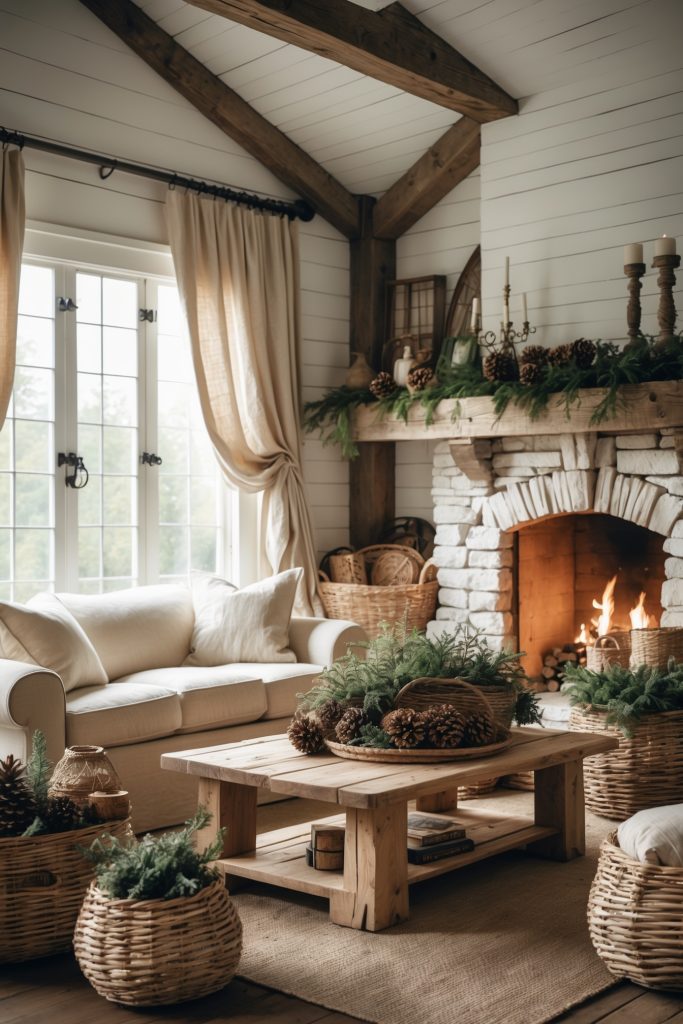 Neutral tones work beautifully in a rustic farmhouse setting, offering a cozy yet refined atmosphere.