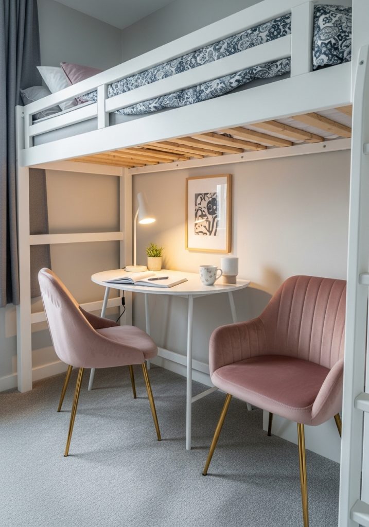 Layer your lofted bed with blush, lavender, or ivory bedding, mixing different textures like velvet, faux fur, and eyelet cotton. Overhead, hang a soft canopy or draped fairy lights for a magical effect. Below the bed, create a personal styling zone with a small vanity table, lighted mirror, and a chic chair or ottoman. Storage cubes with pink or gold accents help keep makeup, accessories, or school supplies organized while enhancing the theme.