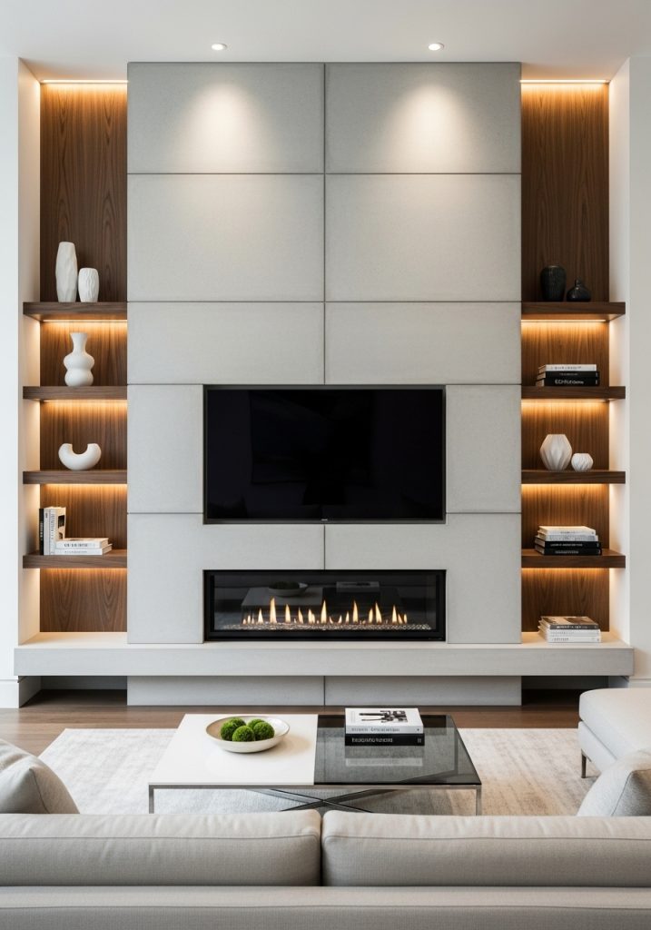 This design blends traditional and contemporary elements, making it versatile for different styles. The combination of the TV and the fireplace is a clever way to enjoy both entertainment and comfort. It’s a great example of how to integrate modern technology into a classic setting.