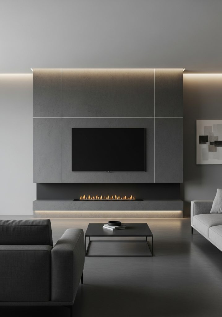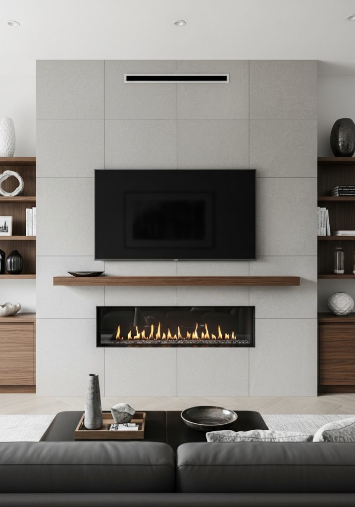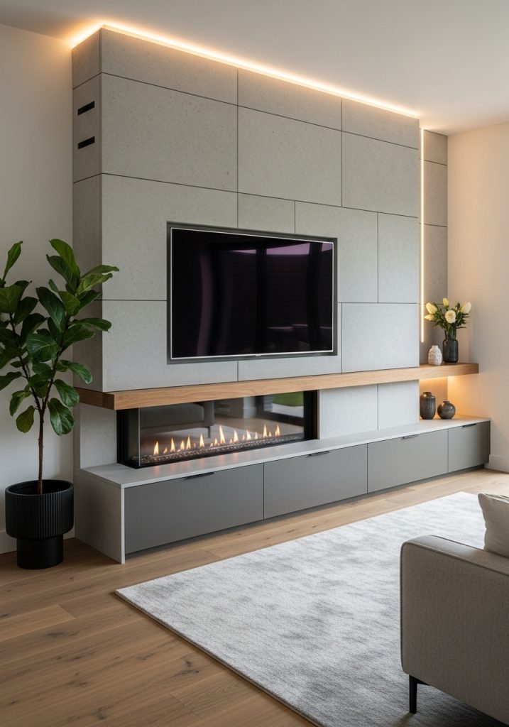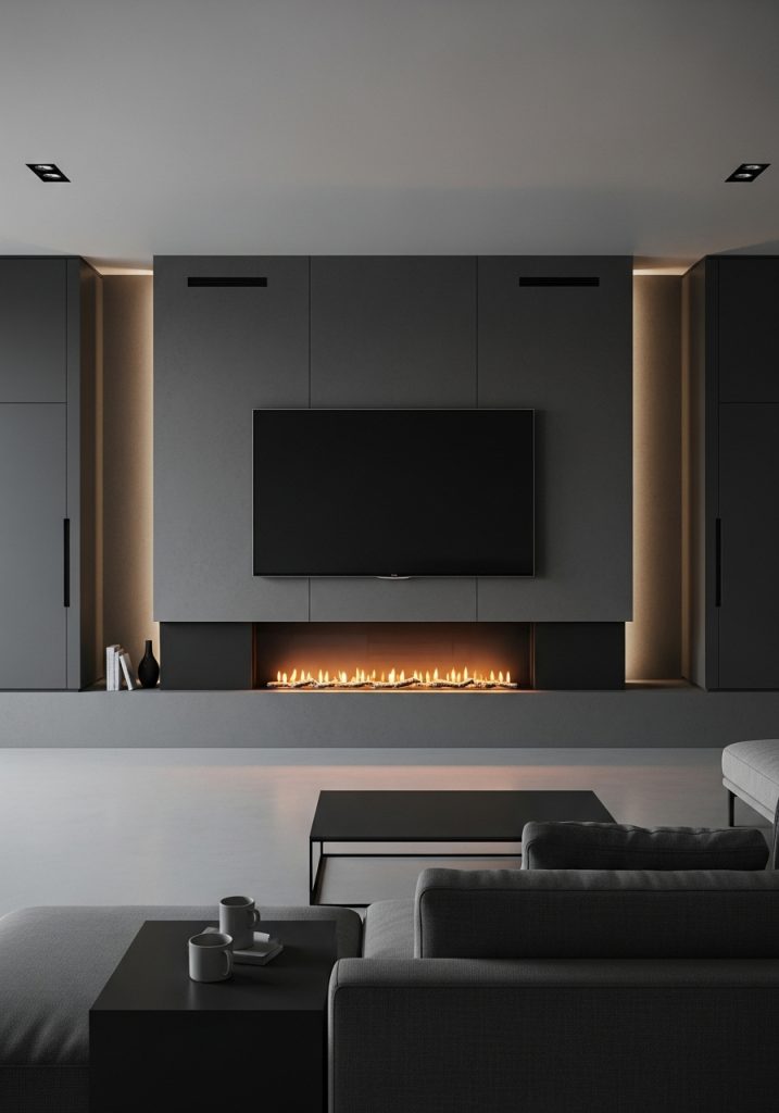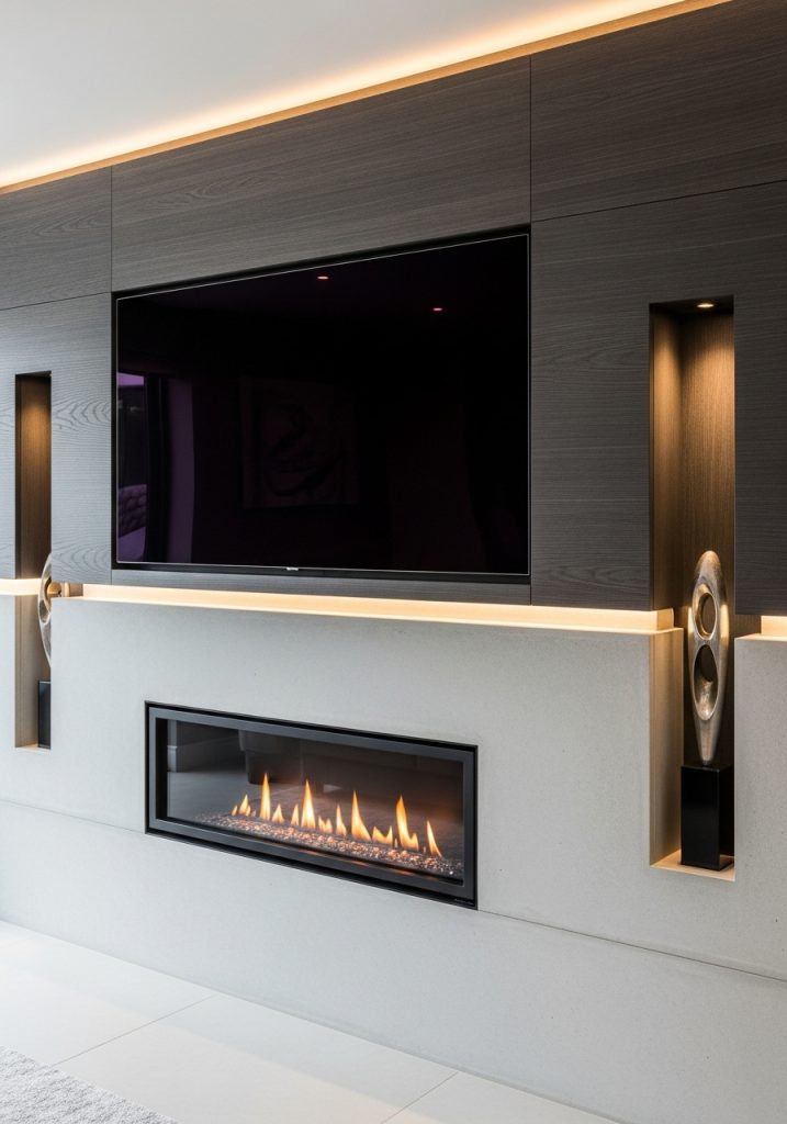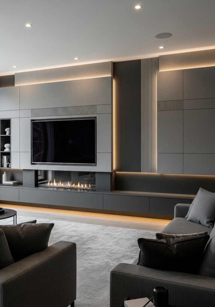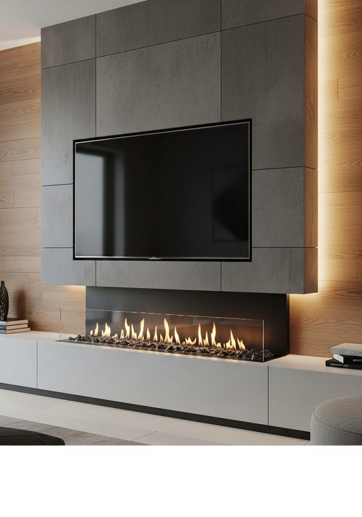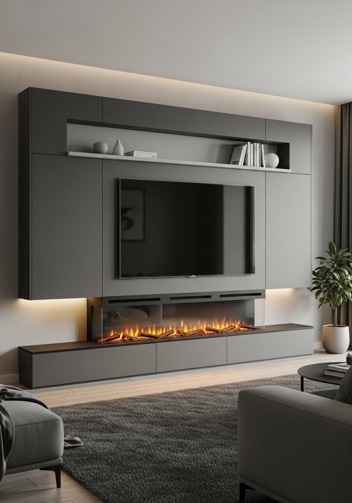 The TV is mounted centrally, creating a focal point that draws the eye. Below the screen, a cozy electric fireplace adds warmth and a touch of modern comfort. This combination makes for a perfect spot to unwind after a long day.