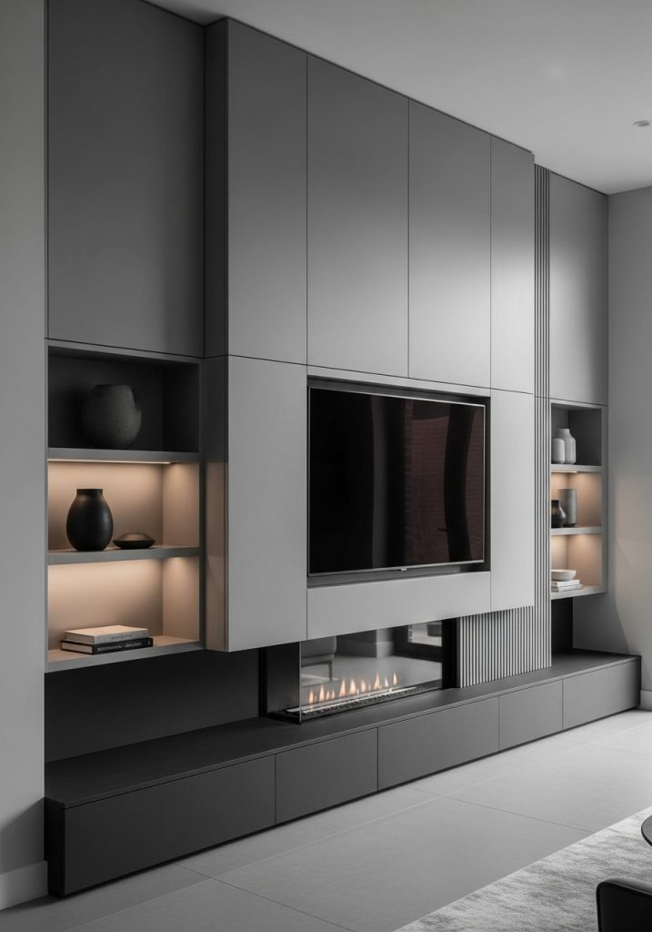 A modern built-in entertainment center can transform your living space into a cozy hub for relaxation and entertainment. This design features a sleek, white cabinetry that blends seamlessly with the room’s decor. The built-in shelves provide a perfect spot for books, decorative items, and personal touches, making the space feel inviting.